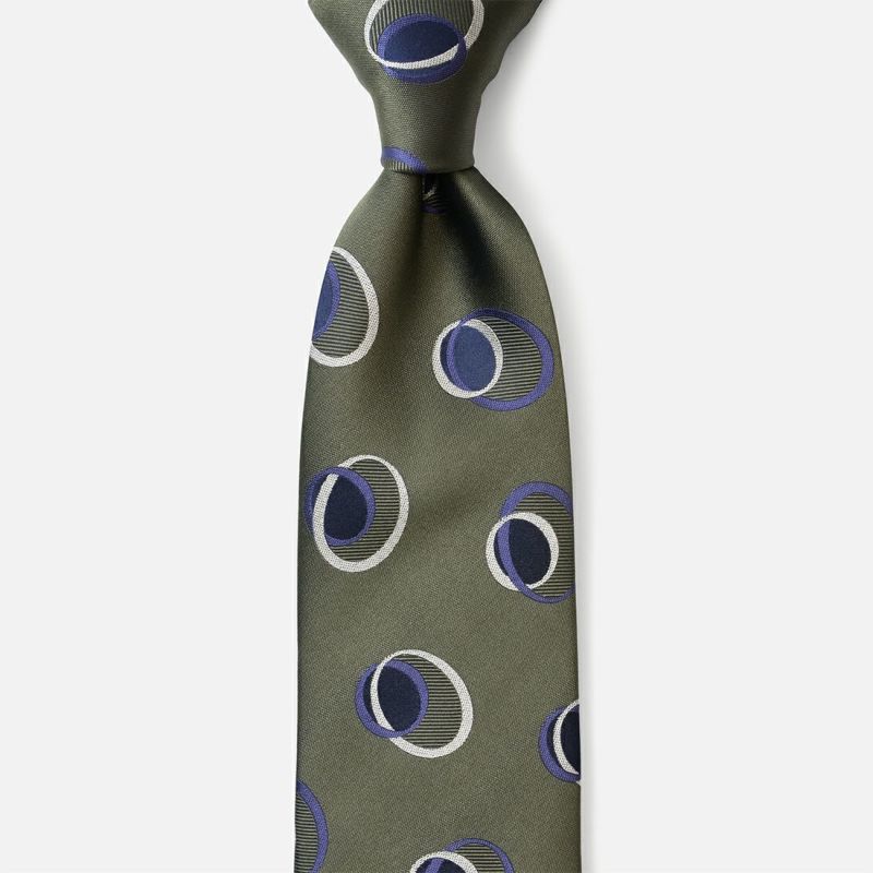 大小の強弱をつけたサークルモチーフが立体的で雰囲気のよい配色が印象的な一本。オンビジネスからオケージョンなどにも幅広く締められるネクタイです。