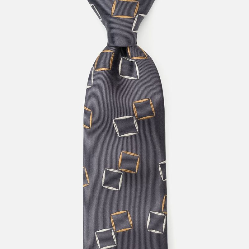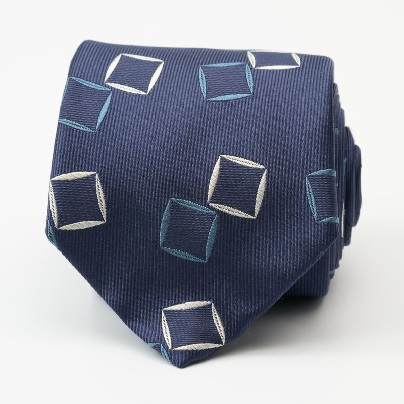 落ち着きのあるベースカラーに、絶妙な位置に配されたスクエア柄が映えるモダンな一本。