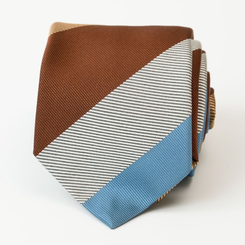 明るめのネイビーとブルーのレップ組織にベージュとホワイトの綾組織の配色は、バランスが取れておりデイリーに締めやすい1本です。