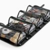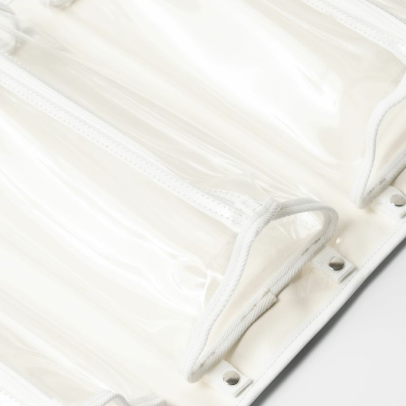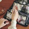 異なる形状のアイテムを一緒に仕舞える、三角柱の透明なPVCケースを内蔵したキャビネットバッグ。