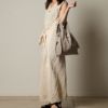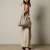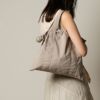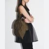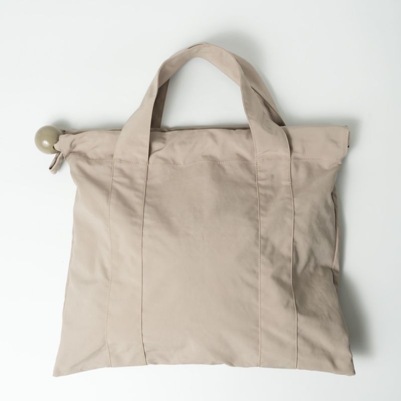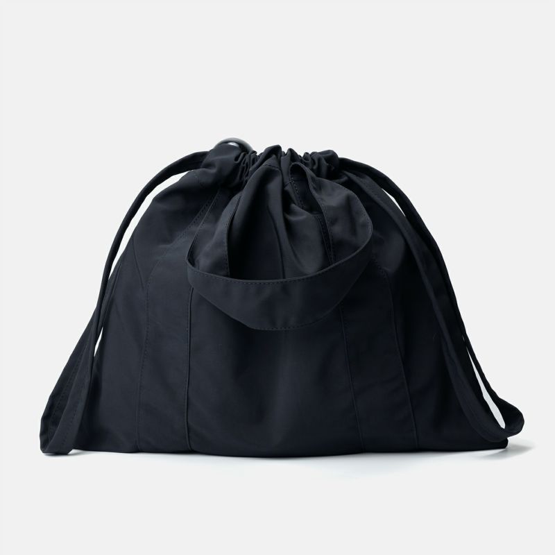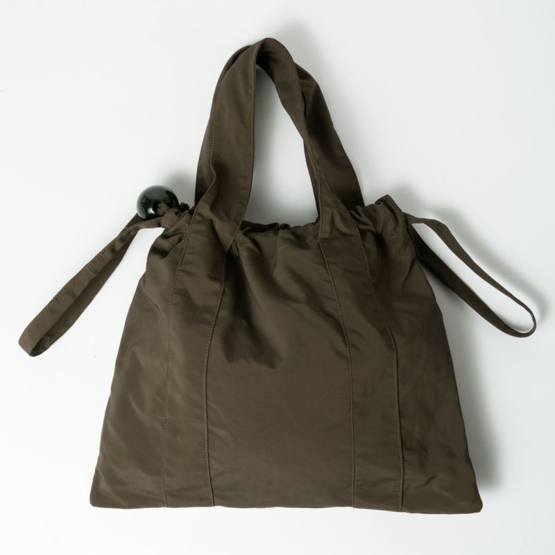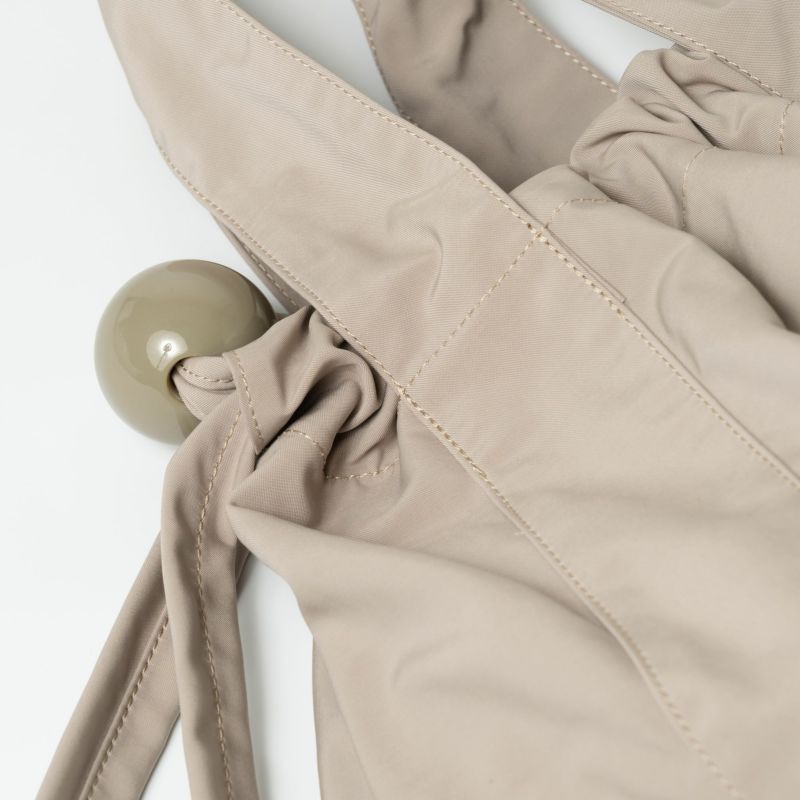しっとりと肉厚なサテン生地を裏使いでまとめています。 ボール玉の艶感とマットな生地の素材のMIX感もチャームポイントです。 口元紐のアレンジでシルエットに変化をつけられ、ハンドと肩掛けの2WAY仕様。 ざっくりとしたフォルムとボール玉の遊び心が可愛いトートバッグです。