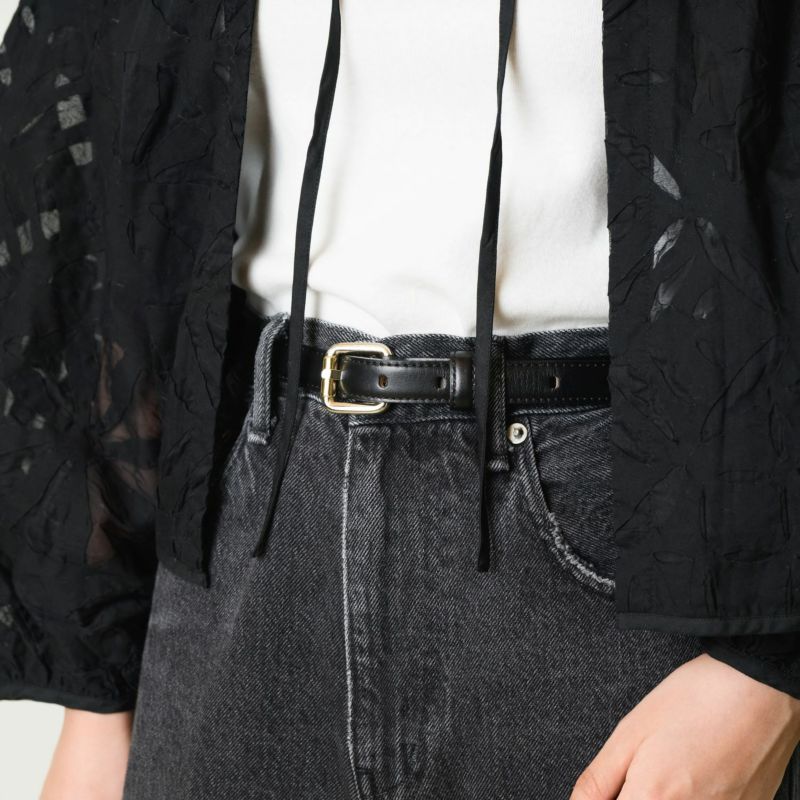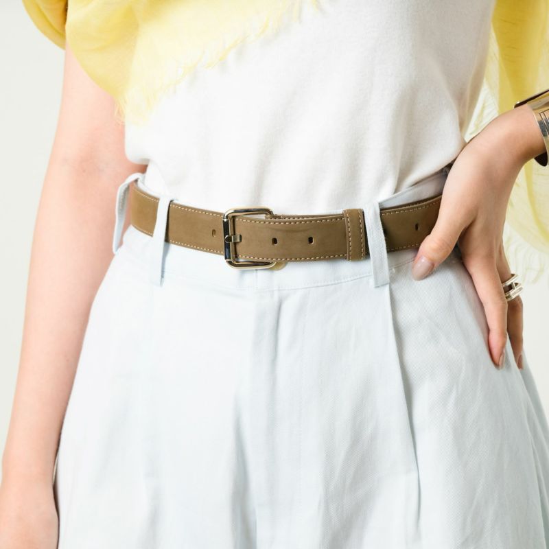プレーンなリング付きバックルをデザインモチーフにした、オリジナルバックルがポイントのミニマムなプレーンベルトです。ゴールドとシルバーMIXのメッキを掛けたバックルは、今シーズンご提案したいお勧めのカラーになります。スタイリングでアクセサリーのカラーをMIXしたい気分の時や、さり気なくウエストにアクセントを付けたい時などに。
