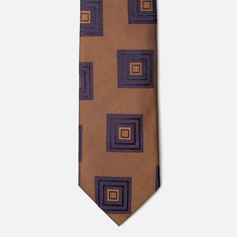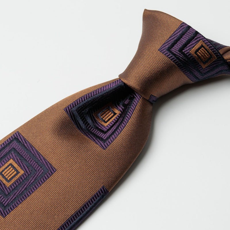 明るめのブラウンベースに大柄のスクエア柄がランダムに配置された1本。
