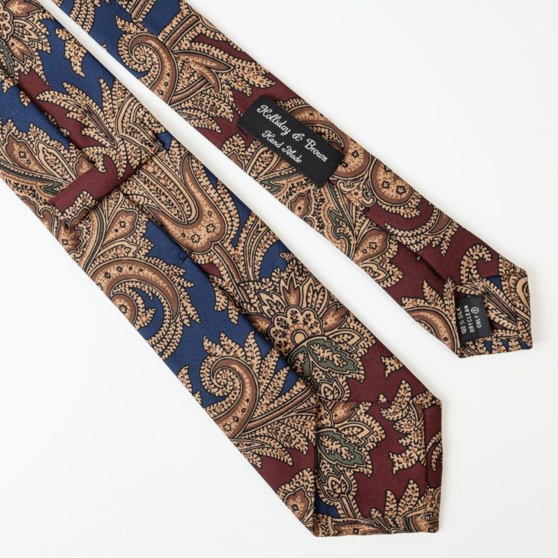 <Holliday & Brown(ホリデー&ブラウン )>より、ヴィンテージ感のあるペイズリープリントに、2色のベースカラーを切り替えることで非常にインパクトのあるVゾーンを演出する一本。クラシックなスタイルの外しとして、また、あえてスカーフのような感覚でカジュアルめにこなすのもまた良しと、幅広いスタイリングを楽しめるネクタイです。