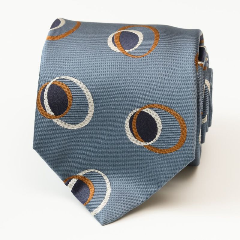 大小の強弱をつけたサークルモチーフが立体的で雰囲気のよい配色が印象的な一本。オンビジネスからオケージョンなどにも幅広く締められるネクタイです。