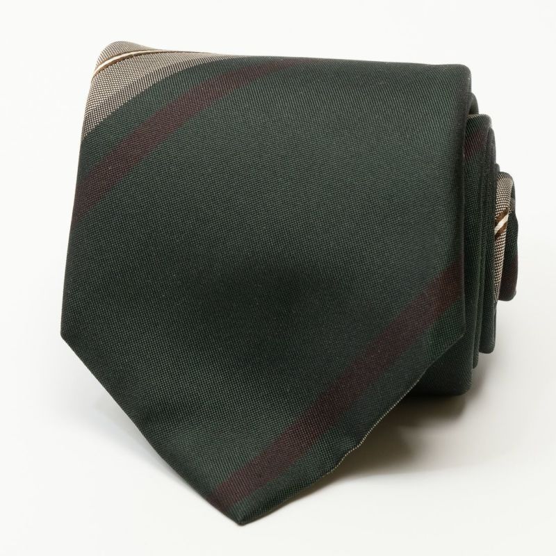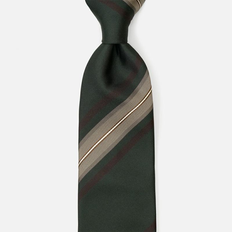 ブリティッシュ系の深みがあるグリーンベースのストライプには、ブラウンとベージュが配色され、男ゴゴロをくすぐる1本となっております。