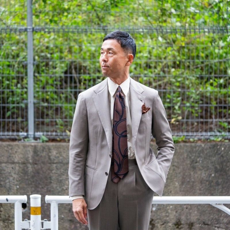 甘めのチョコブラウンにブラックを掛け合わせた、マエストロらしいカラーコンビネーションのネクタイです。胸元に黒を差し込むことで洒脱な雰囲気を醸し出す、今一押しのスタイルです。 並木「過去のYoutube動画でもおすすめしている、ブラックやブラウン・ベージュといったスーツに、ベージュ・クリーム系のシャツやピンクといったカラーシャツを合わせ、このBROWN×BLACKカラーのネクタイを締めていただきたいです。」
