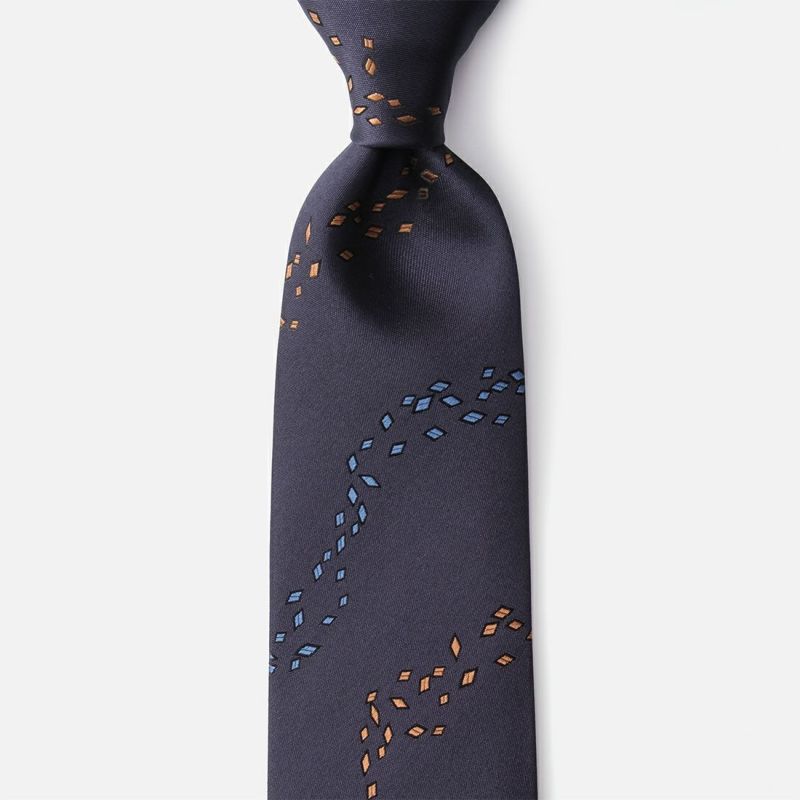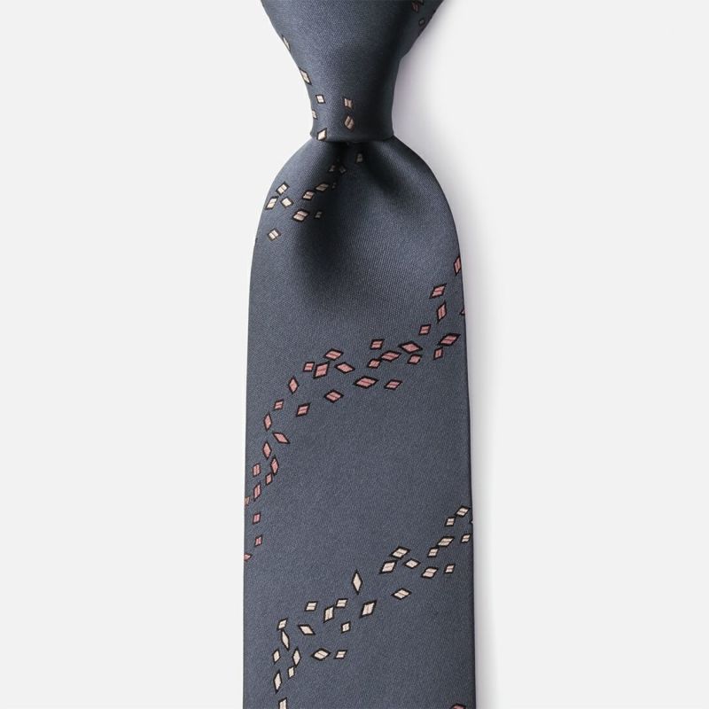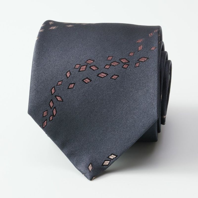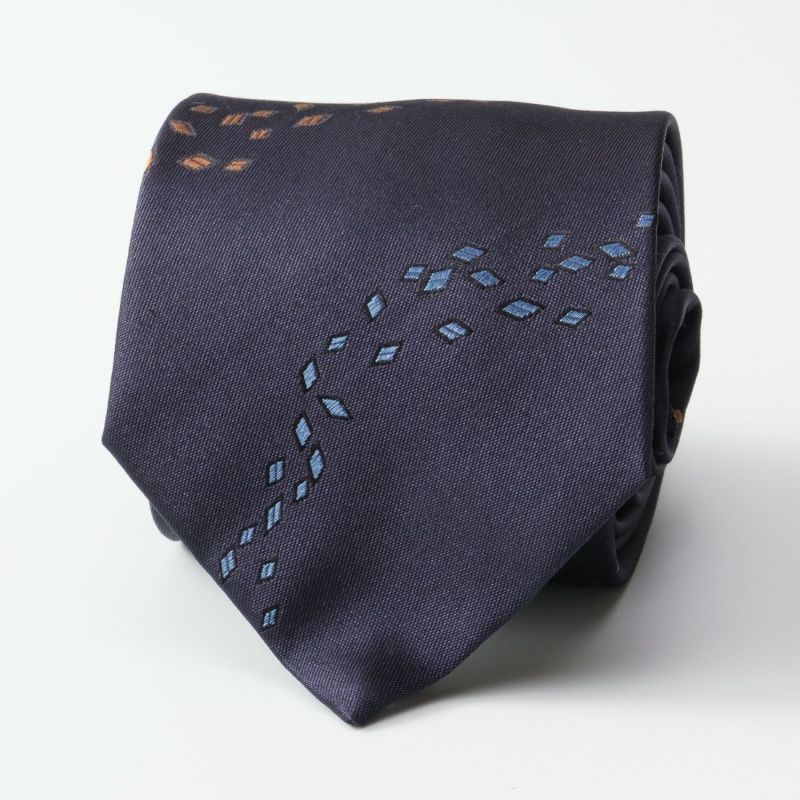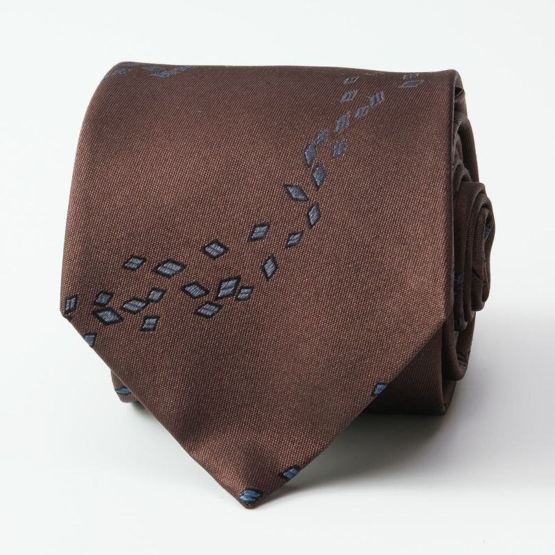 シックなカラーをベースに、小さな菱形モチーフがリズミカルに流れるよう配置された一本。