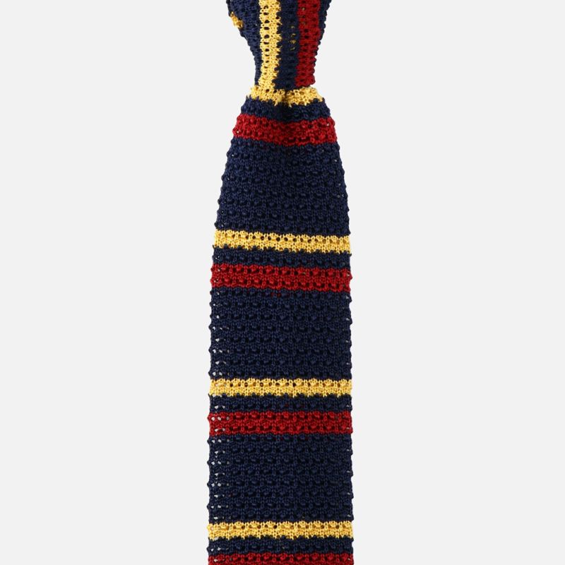 ジャケットスタイルだけでなく、コーディネートにアクセントをプラスしてくれる鮮やかなカラーのボーダーは、色違いでワードローブに加えたいニットタイです。