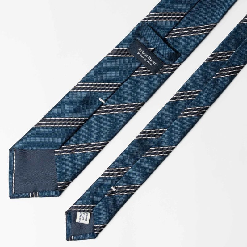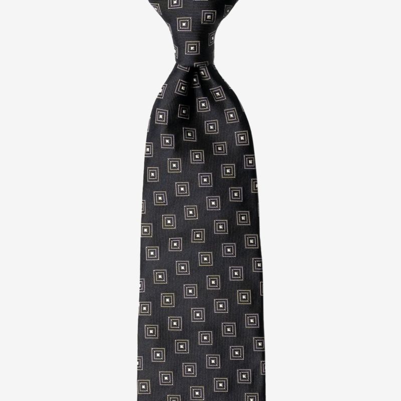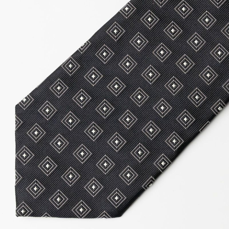 ネイビーをベースにした縦綾という地組織の上にモチーフを飛ばしているこちらのネクタイ。シンプルながら柄に大きな秘密が。中央の四角部分はホワイトながら、それを二重に囲んでいる四角部分にグレージュの糸を使うことで、よりモダンな表情を演出しています。