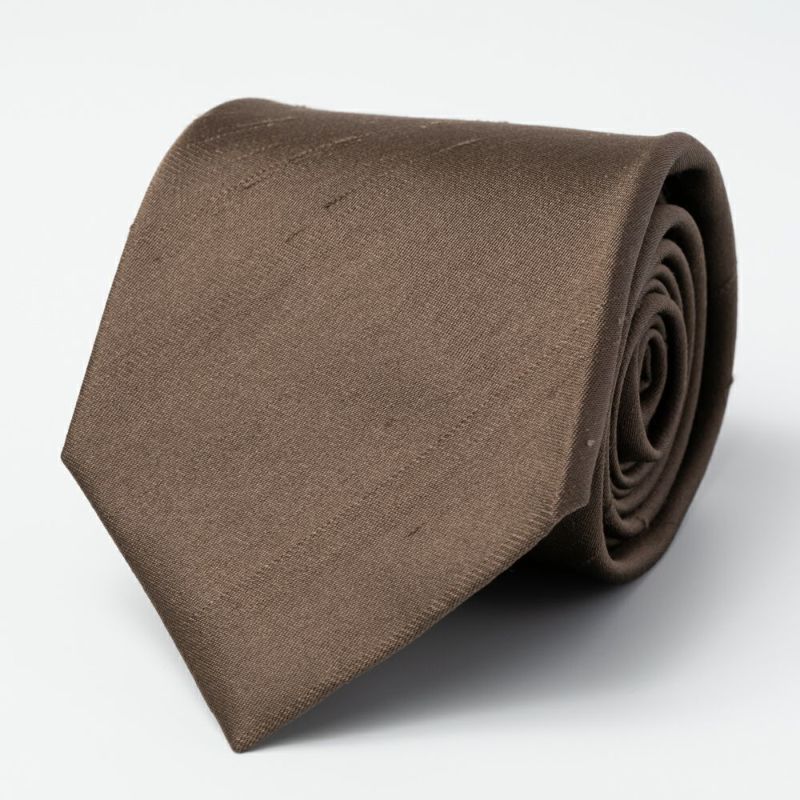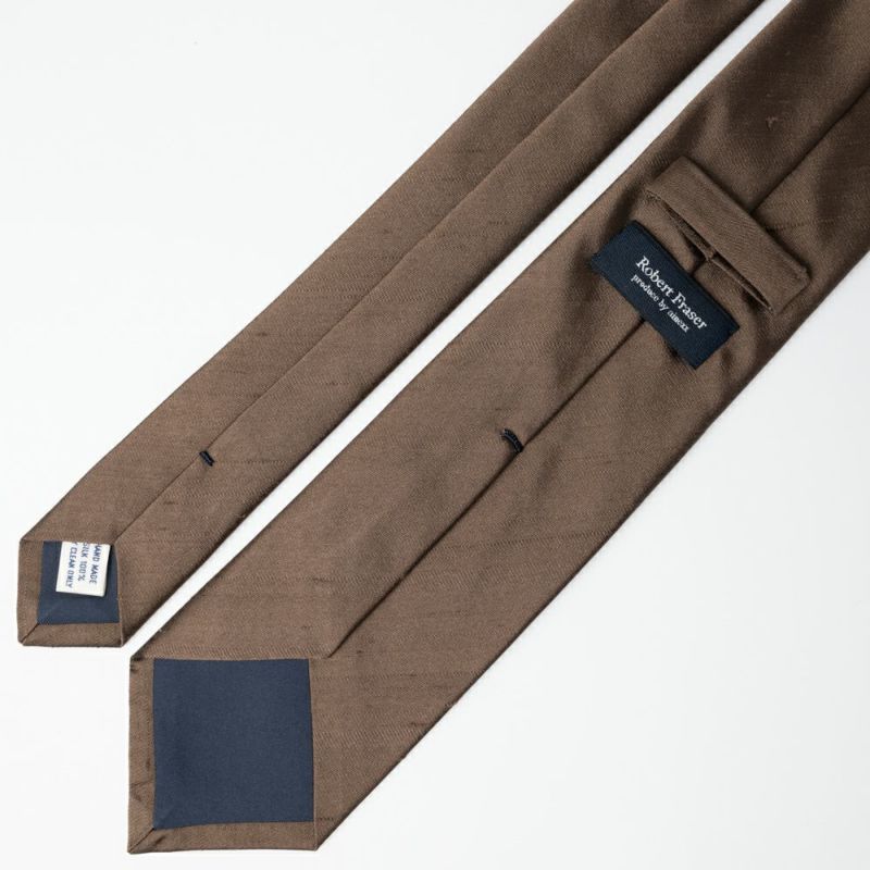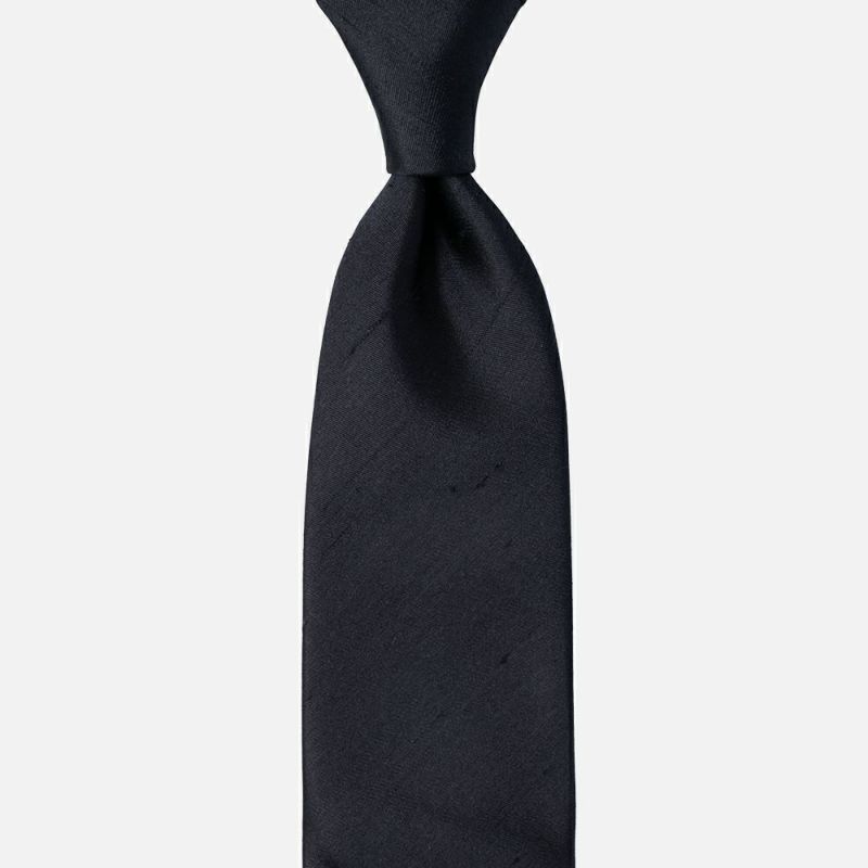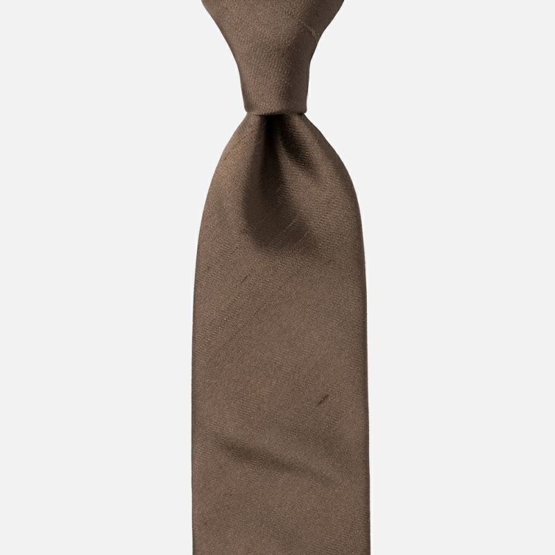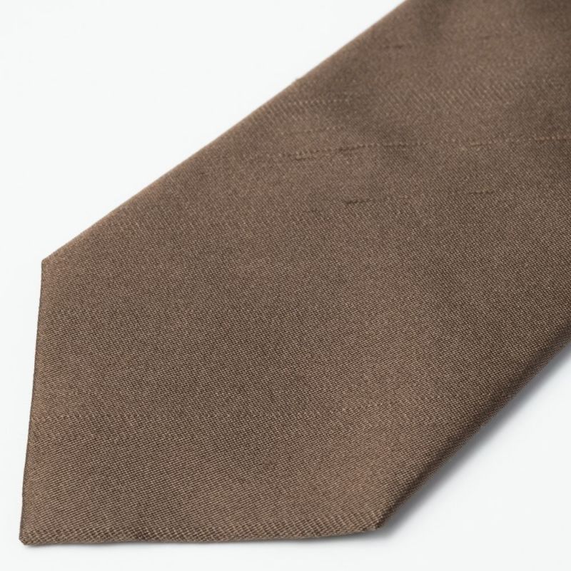 シャンタン生地はヨコ糸に節のあるシルクを使用することで、あえて不均一でざらっとした表面感を作り出したもの。春夏は綿や麻などの素材と、秋冬はウールのツイーディーな素材などと相性が良く、オールシーズン使用しやすい素材です。また、上品な光沢があるため、エレガントにドレスアップしたいシーンにおいても使用できる汎用性の高いネクタイです。