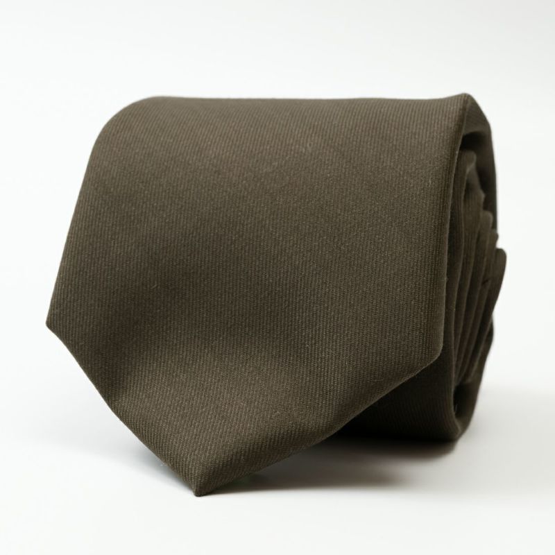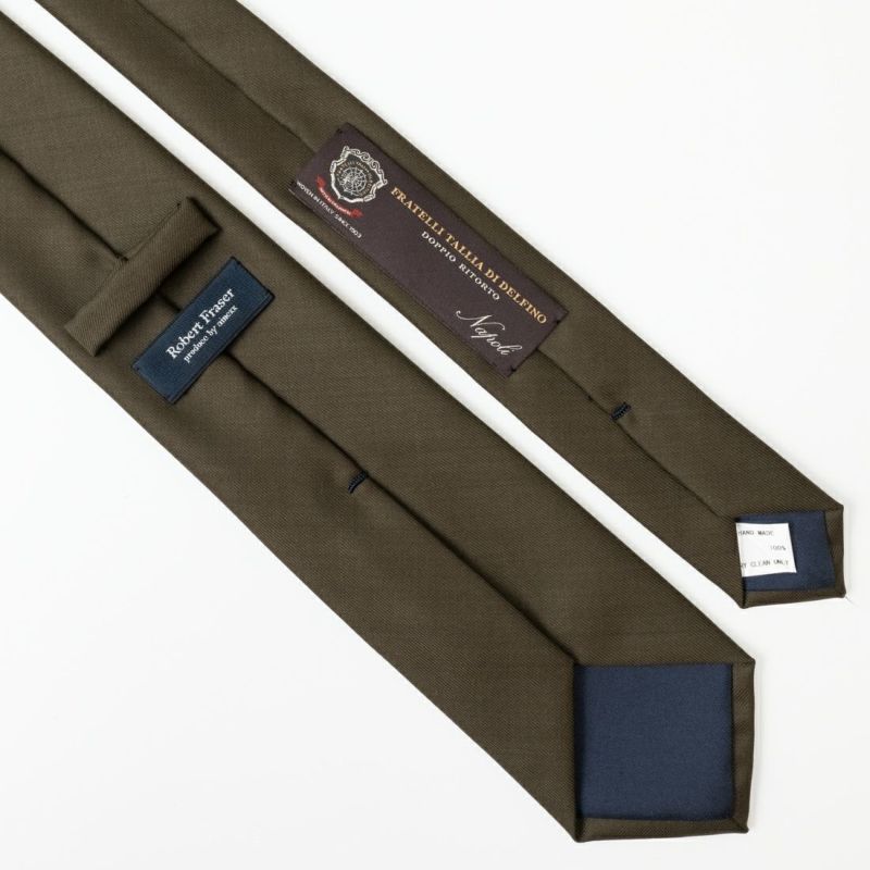 やや浅めのブラウンが洒脱なタテ綾織生地は、イタリア・ビエラ地方で創業100年以上の歴史を誇る最高級服地メーカー「TALLIA DI DELFINO社」の生地を使用した上質なウール生地です。本来スーツ等に使用される生地のためしなやかかつ、手触りの良い手持ち感があり、シルクの風合いとも一味違ったVゾーンを演出してくれること間違いありません。