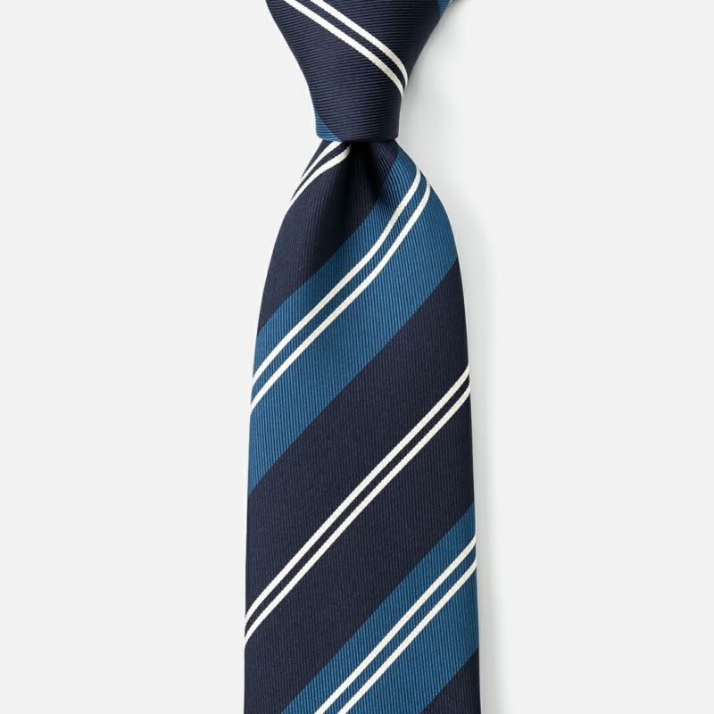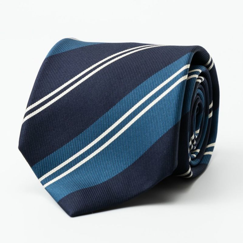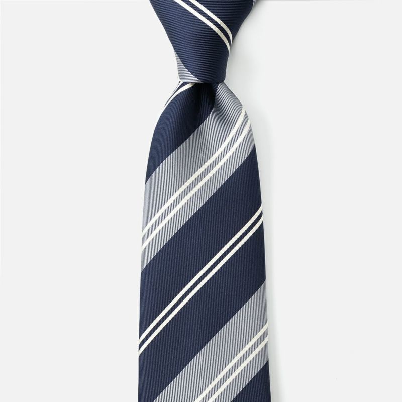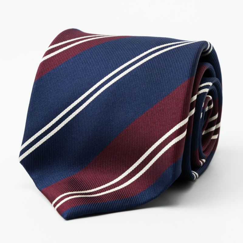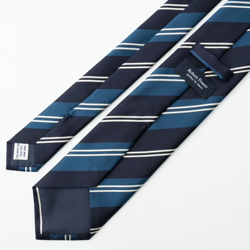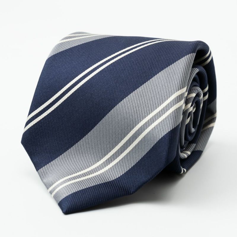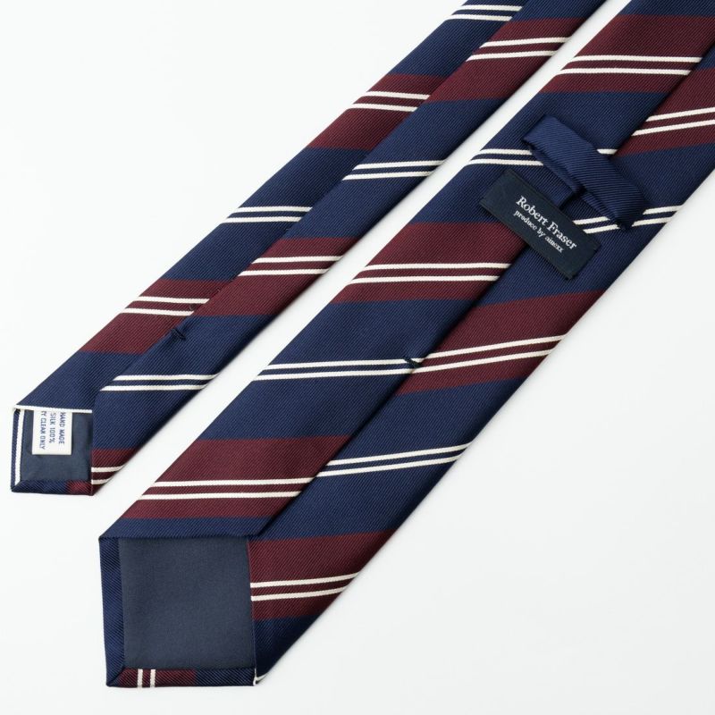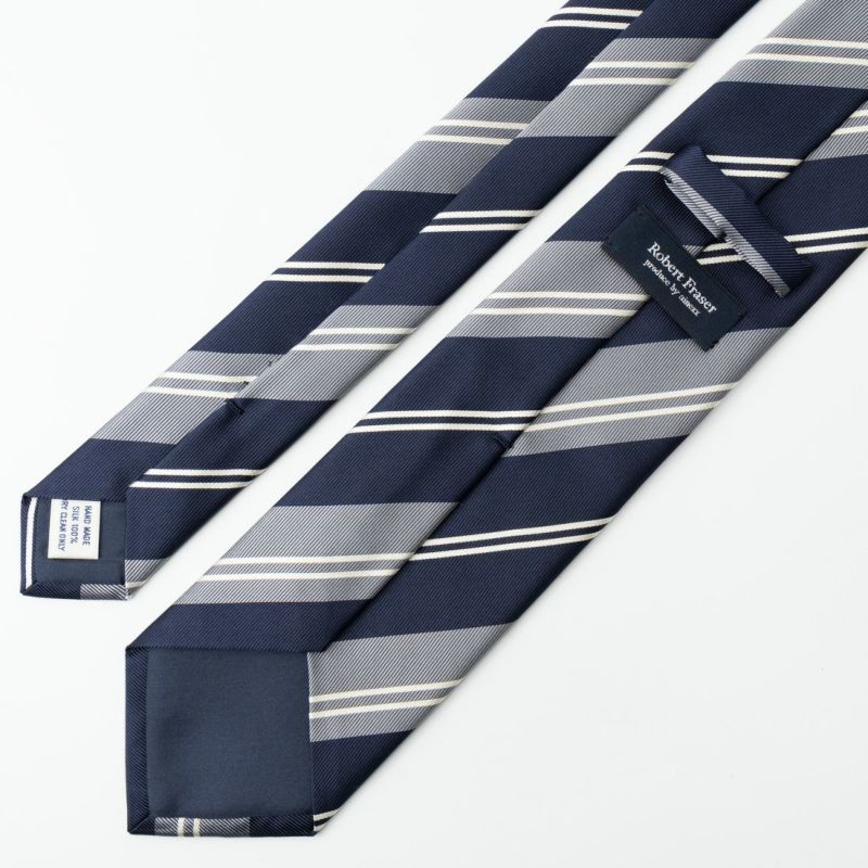 <ROBERT FRASER(ロバート フレイザー)>より、フレッシャーズにも対応したベーシックストライプタイの登場です。 ネイビーをベースにグレー、ワイン、ブルーのストライプを配し、分かりやすくオーソドックスな柄域に仕上げており、フレッシャーズからオンビジネスまで、Vゾーンに好印象をもたらします。