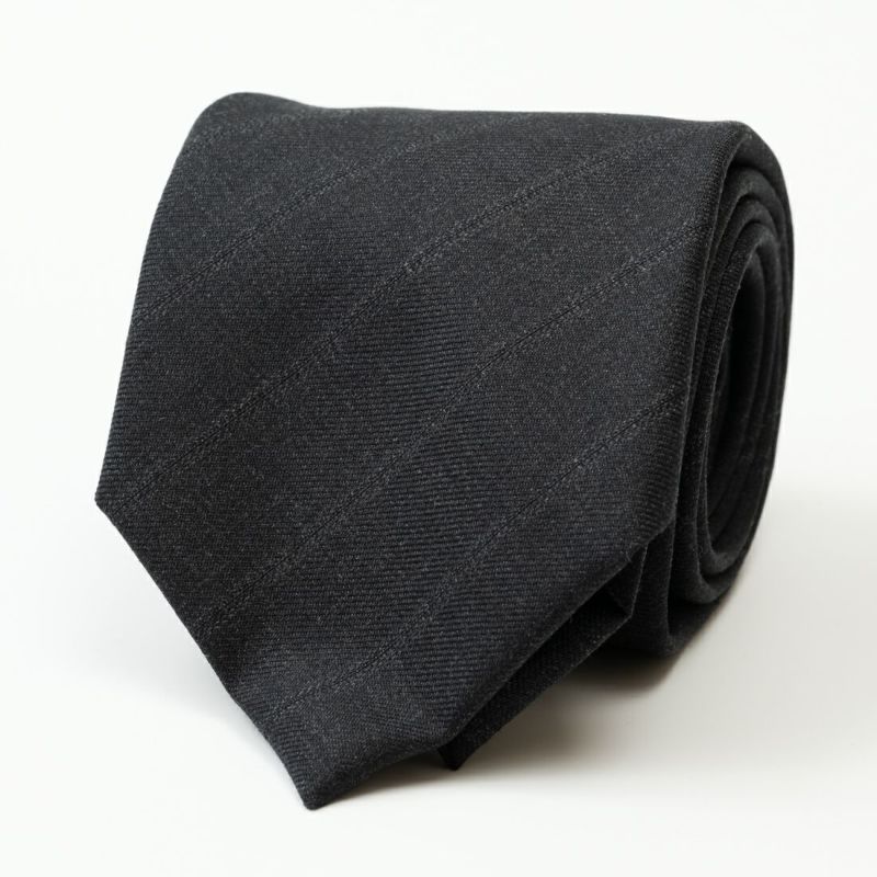 チャコールグレーをベースにシャープなストライプを配したクラシカルな雰囲気が漂う生地は、イタリア・ビエラ地方で創業100年以上の歴史を誇る最高級服地メーカー「TALLIA DI DELFINO社」の生地を使用した上質なウール生地です。本来スーツ等に使用される生地のためしなやかかつ、手触りの良い手持ち感があり、シルクの風合いとも一味違ったVゾーンを演出してくれること間違いありません。