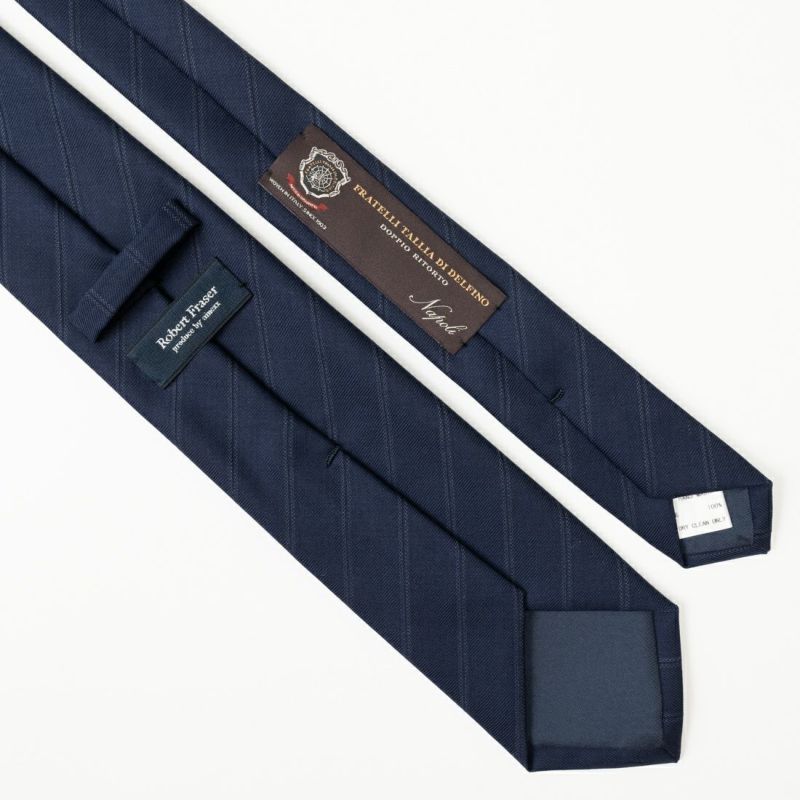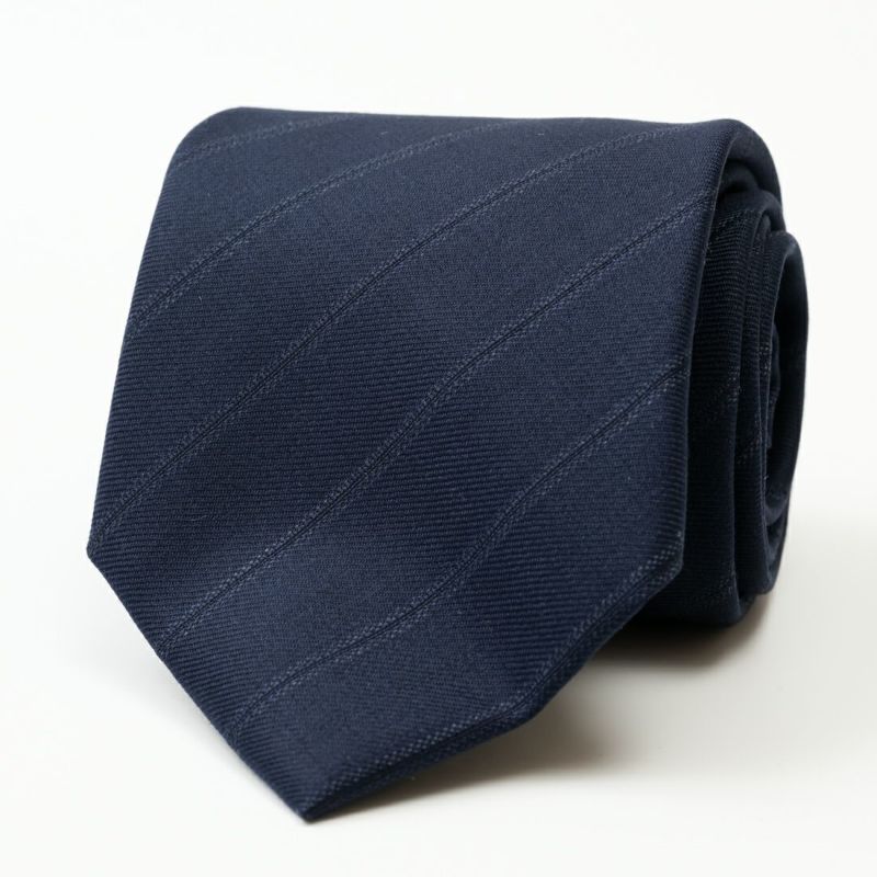 ネイビーをベースにシャープなストライプを配した生地は、イタリア・ビエラ地方で創業100年以上の歴史を誇る最高級服地メーカー「TALLIA DI DELFINO社」の生地を使用した上質なウール生地です。本来スーツ等に使用される生地のためしなやかかつ、手触りの良い手持ち感があり、シルクの風合いとも一味違ったVゾーンを演出してくれること間違いありません。