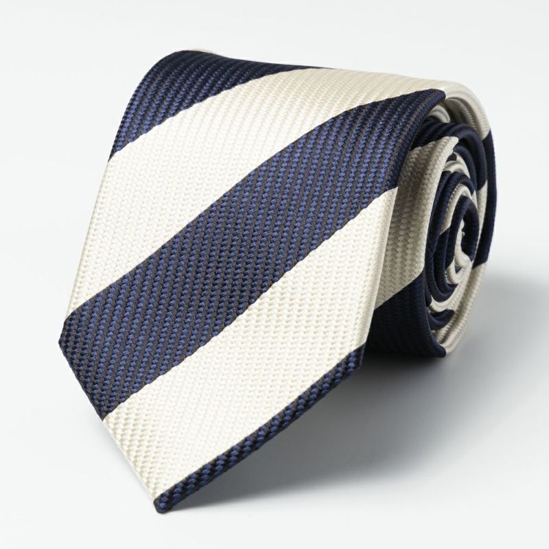 ストライプ部分には濃色と淡色の2色の糸を使うことで、一見単色に見えるストライプに変化をつけているこだわりのデザインです。春夏シーズンらしい爽やかな印象を与えるネクタイです。
