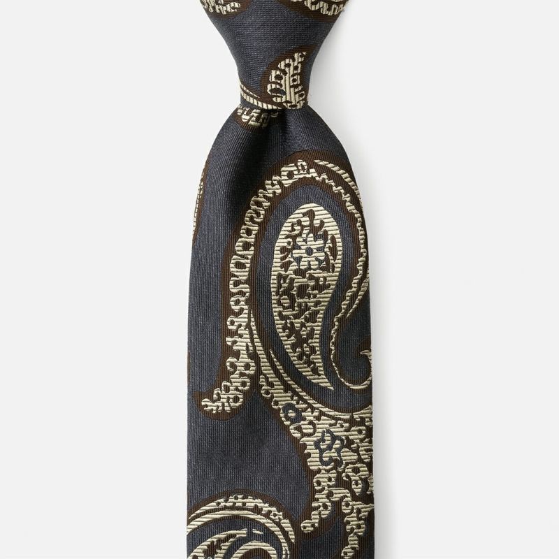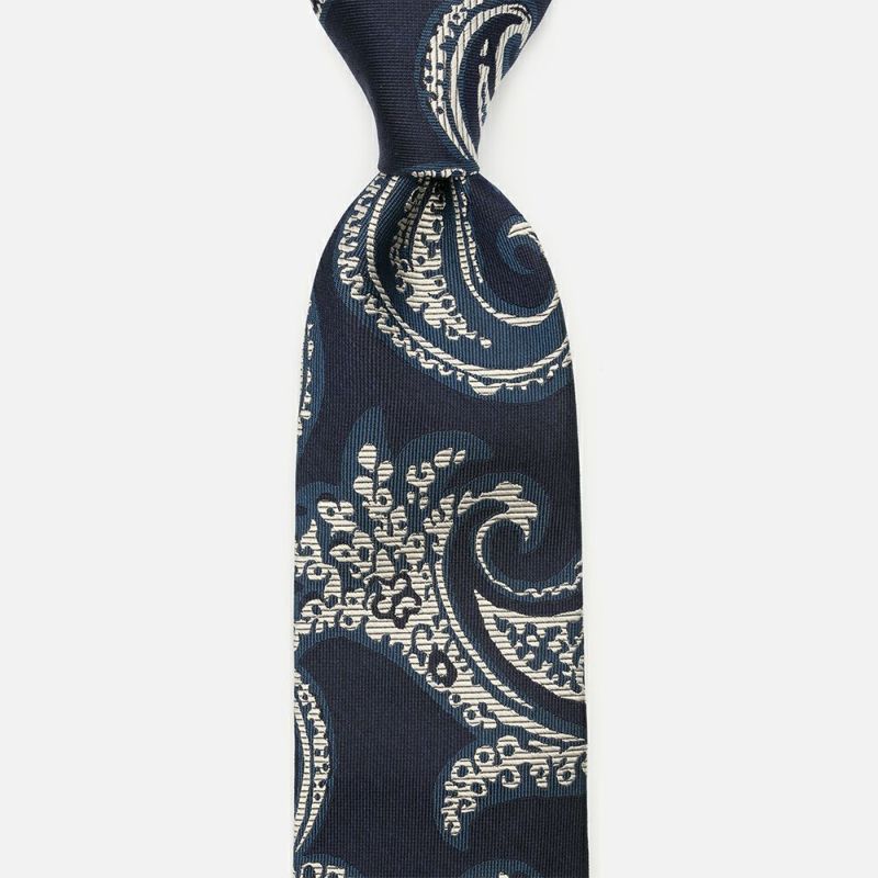 存在感のあるジャカードのペイズリー柄を今シーズンらしい淡いトーンで表現し、グレーベースに乗せたトレンド感のある一本。高級感もあり、ネイビースーツはもちろん、グレーやブラウンなどにも合わせやすいので、活躍できます。