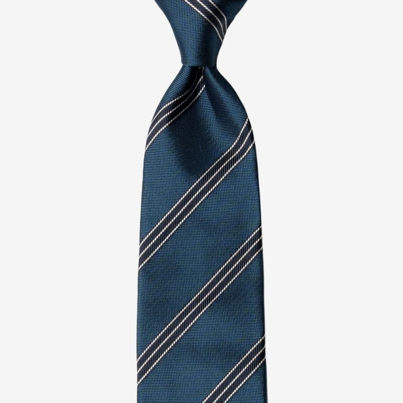 ネイビーをベースにした縦綾という地組織の上にモチーフを飛ばしているこちらのネクタイ。シンプルながら柄に大きな秘密が。中央の四角部分はホワイトながら、それを二重に囲んでいる四角部分にグレージュの糸を使うことで、よりモダンな表情を演出しています。