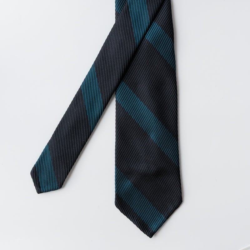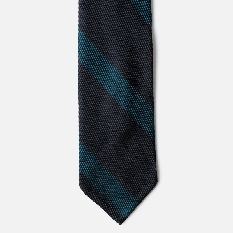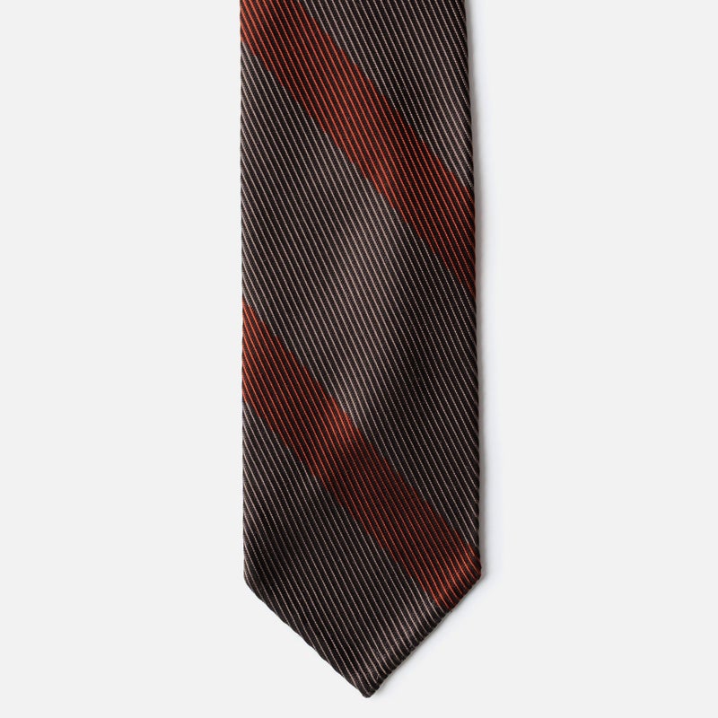 レップ組織が際立つ端正な一本。裏地無しの三巻仕様で型崩れしにくいしっかりした打ち込みの生地感。光沢感は控えめで、きちんと感はありながらも裏地無しゆえ軽快なムードを醸します。