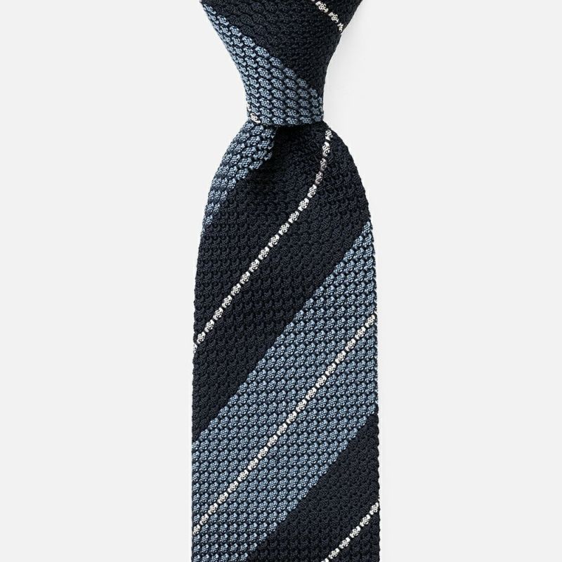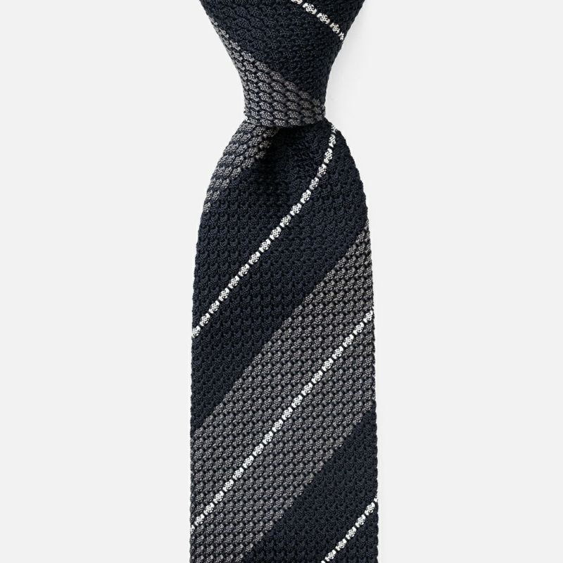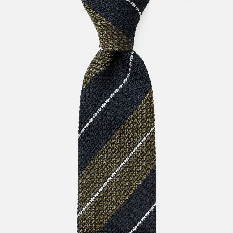 ネイビーをベースに、ブルーやブラウン、オリーブなどのカラーを配色しているため、涼感はありながらも落ち着いた雰囲気があり、非常にコーディネートの組みやすいネクタイです。
