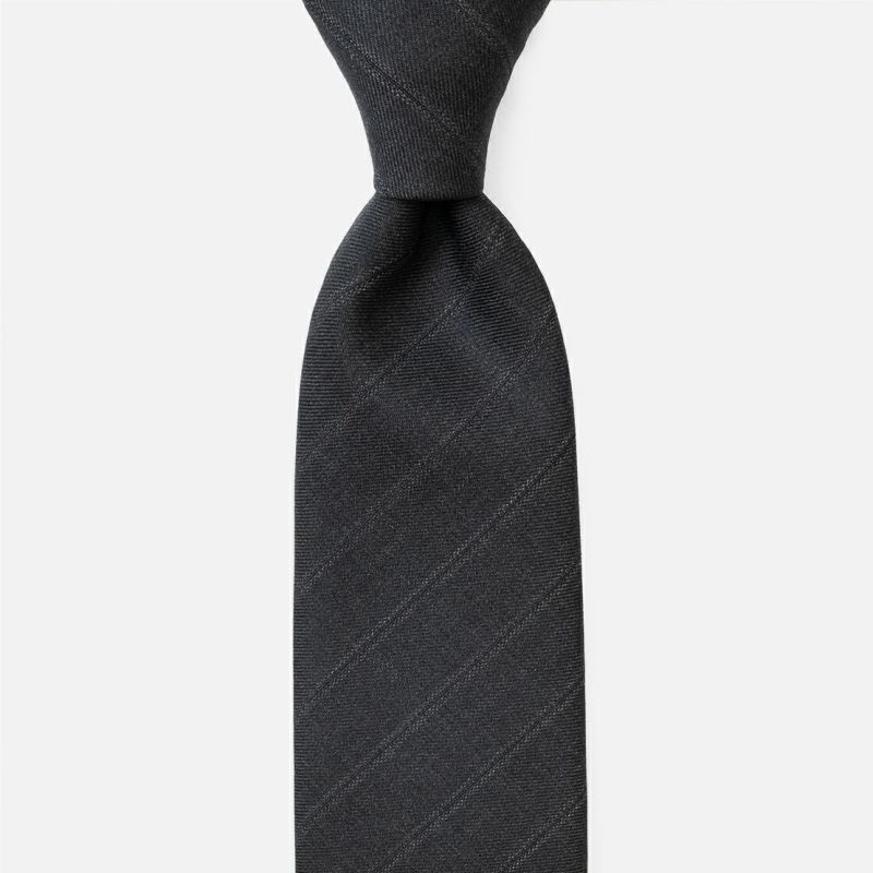 チャコールグレーをベースにシャープなストライプを配したクラシカルな雰囲気が漂う生地は、イタリア・ビエラ地方で創業100年以上の歴史を誇る最高級服地メーカー「TALLIA DI DELFINO社」の生地を使用した上質なウール生地です。本来スーツ等に使用される生地のためしなやかかつ、手触りの良い手持ち感があり、シルクの風合いとも一味違ったVゾーンを演出してくれること間違いありません。