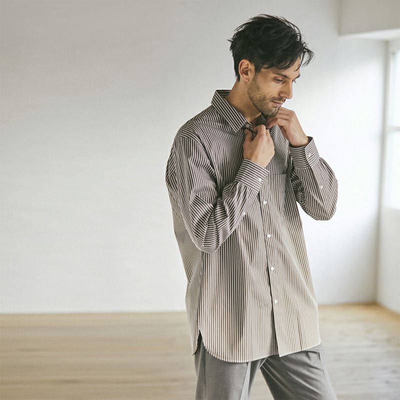 ブラウンのストライプシャツはライトグレーのパンツと合わせて大人の゛シャツイチコーデ″で!