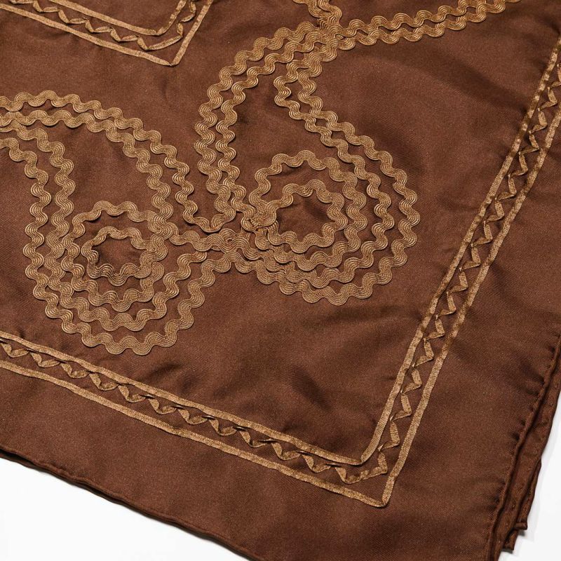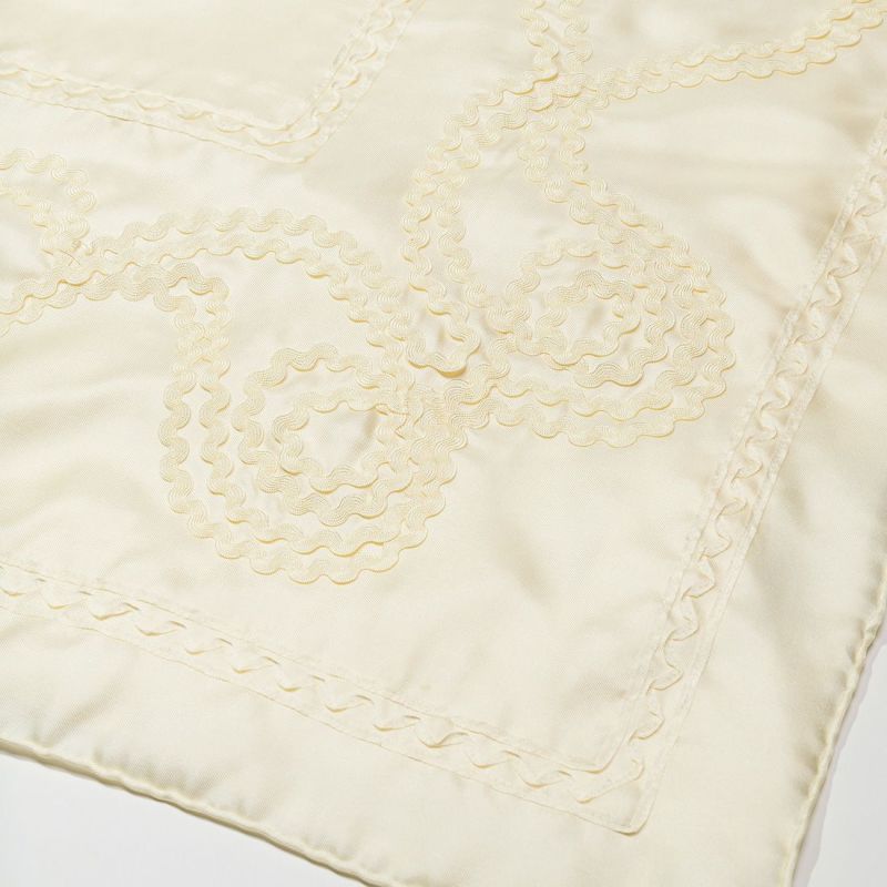 エンブロイダリーレースで作られたヴィンテージドレスのペイズリー柄を、コード刺繍を用いてシルクスカーフにモディファイを。ペイズリー柄を再現するため、珍しい曲線のテープをコード刺繍のテクニックで曲線状に生地に縫い付けるという大変難易度の高い希少な職人技を用いて柄を表現しています。生地とテープが同色で無地ライクなため、様々なコーディネートに使いやすいのが魅力。圧倒的な存在感でシンプルなコーディネートを優雅な印象へと格上げしてくれます。ヘムの仕上げは熟練の手巻き職人が1点ずつ手作業で極細の状態に巻き上げています。