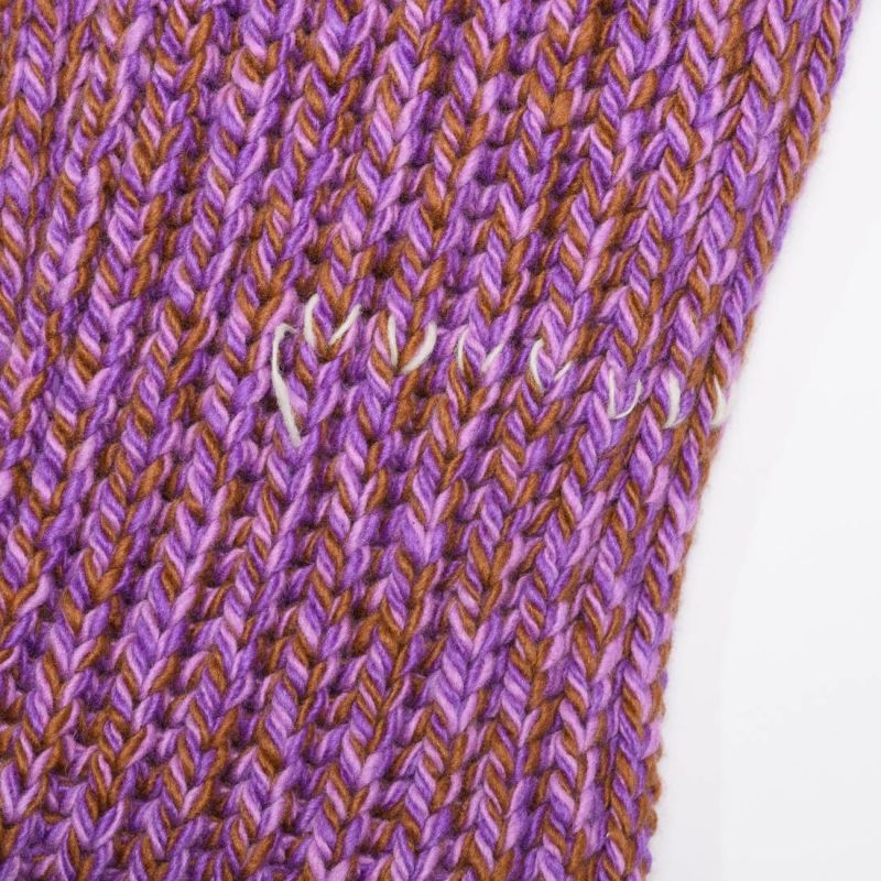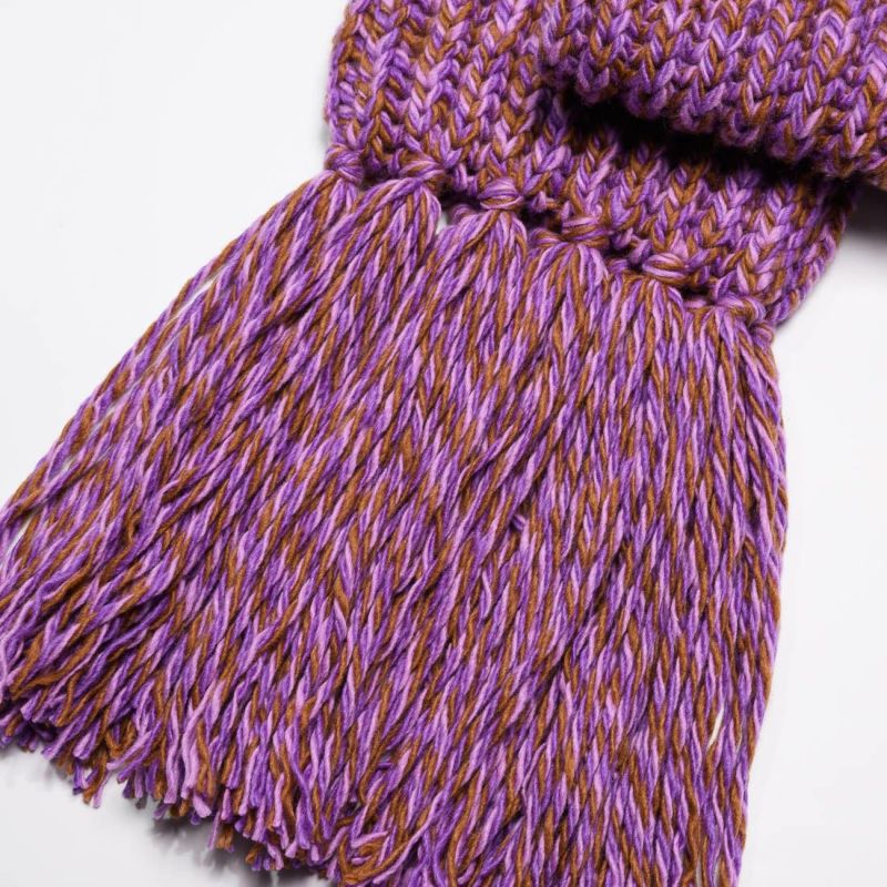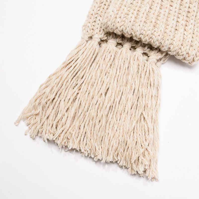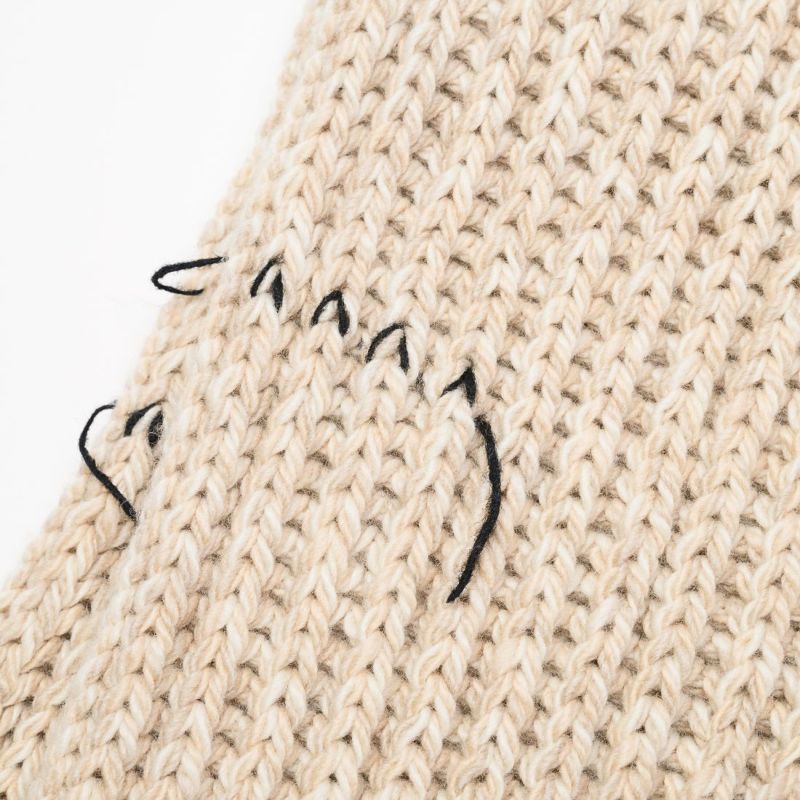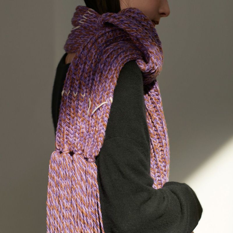 スコットランドで伝統的に作られる手編みのウールローゲージニットの雰囲気にインスピレーションを得て生まれたマフラー。ウールの代わりに採用したのは非常に太いカシミヤ100%の特別な糸。巻いたときに硬さやごわつき、重さがないのに、首元でマフラーがたつような立体感を実現するためにこの糸を採用しました。編み目に合わせて部分的にアクセントで施したステッチはニットの穴空きを補修する際の技術を応用したもの。編み目にそったステッチがさりげなく主張しつつも、巻く度に楽しげな気持ちにしてくれる製品です。