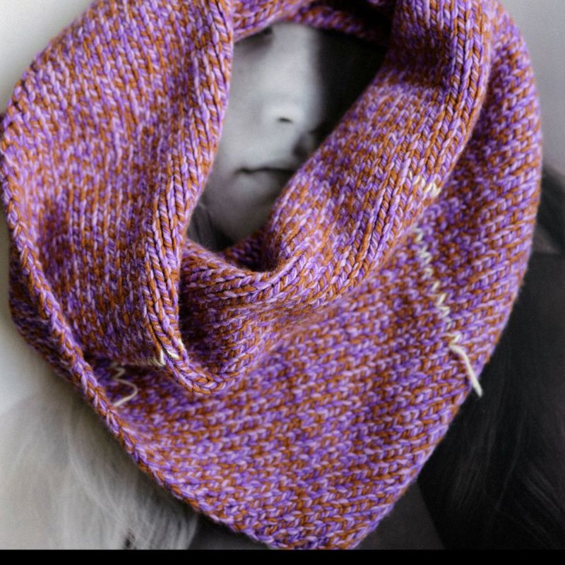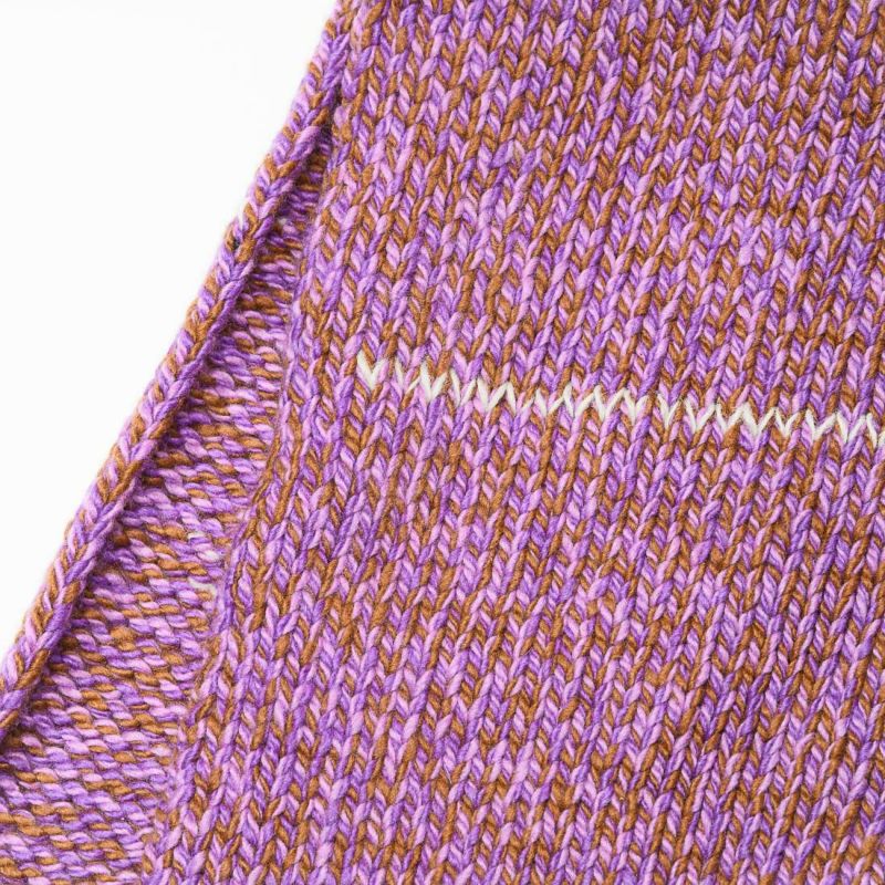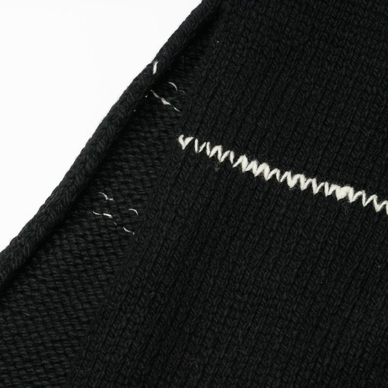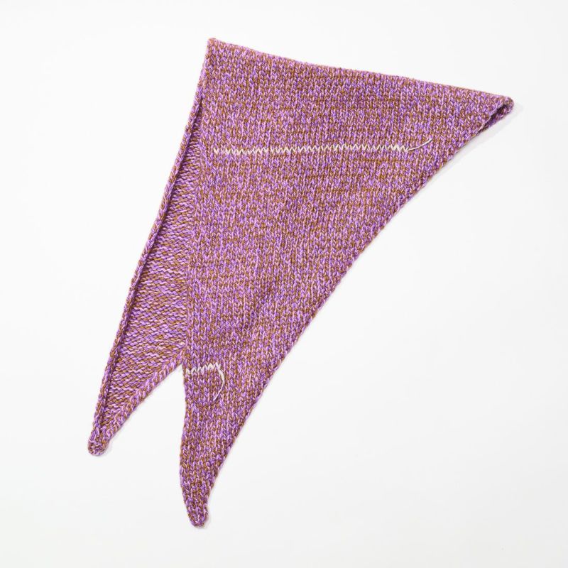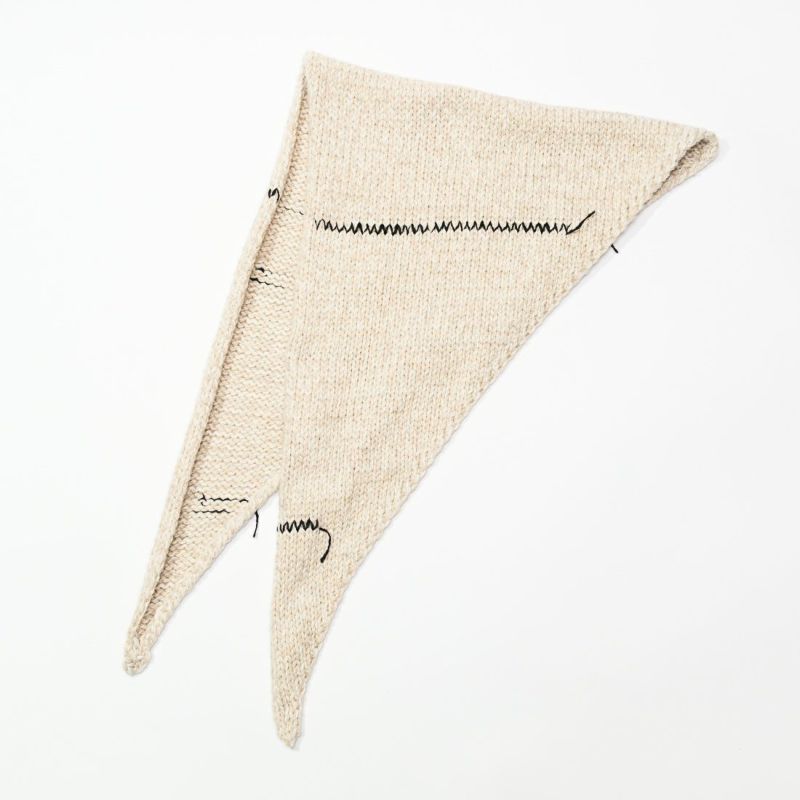 スコットランドで伝統的に作られる手編みのウールローゲージニットの雰囲気にインスピレーションを得て生まれたトライアングルマフラー。ウールの代わりに採用したのは非常に太いカシミヤ100%の特別な糸。巻いたときに硬さやごわつき、重さがないのに、首元でマフラーがたつような立体感を実現するためにこの糸を採用しました。編み目に合わせて部分的にアクセントで施したステッチはニットの穴空きを補修する際の技術を応用したもの。編み目にそったステッチがさりげなく主張しつつも、巻く度に楽しげな気持ちにしてくれる製品です。
