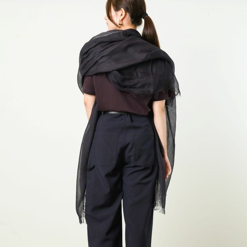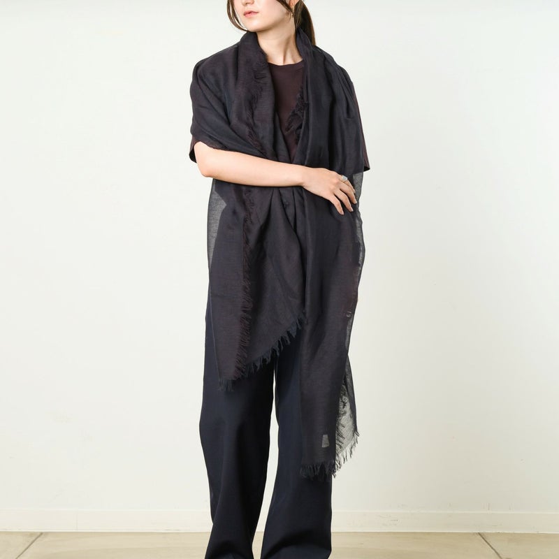 春の軽やかな巻き物として、夏は冷房や強い日差しから肌を守る一枚。イタリア国内でのみ紡績可能なモダール・リネン・シルクの三種類の糸を織り上げた、唯一無二の素材感です。光を浴びるたびにメランジの濃淡が揺らぎ、スタイリングに奥行きと洗練をもたらします。纏うたび光のあたり具合で印象が変わる、感性に響くストール。ご自宅で手洗い可能という、デイリーラグジュアリーな製品です。