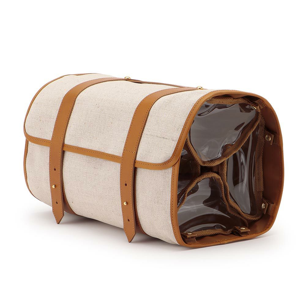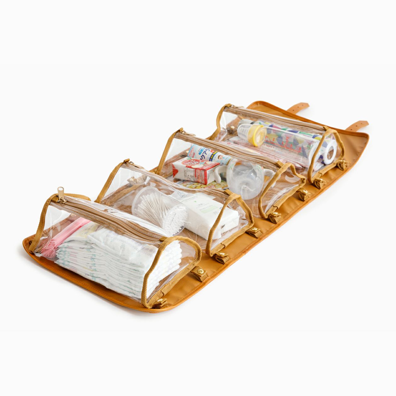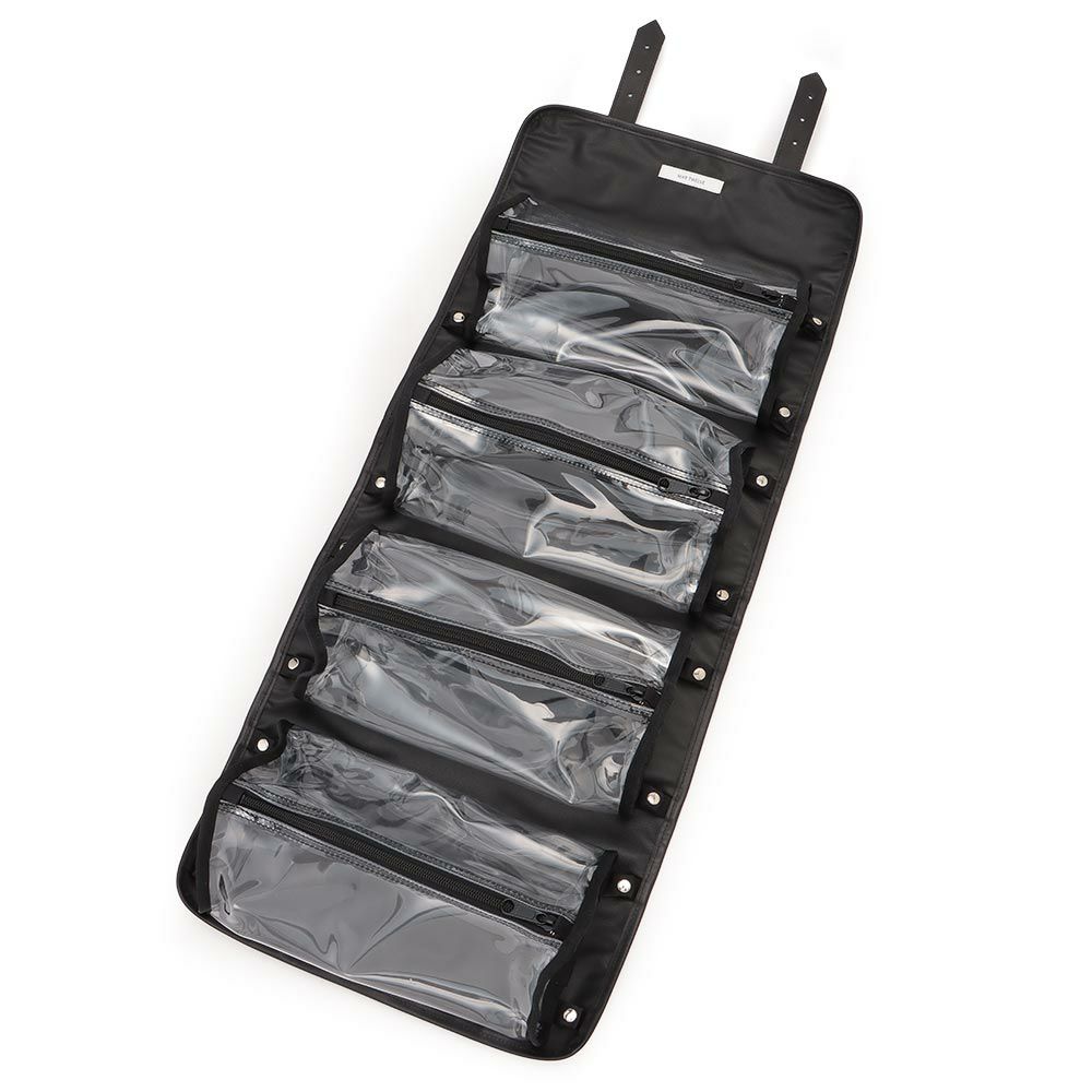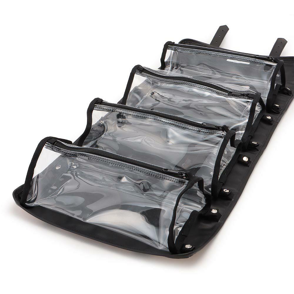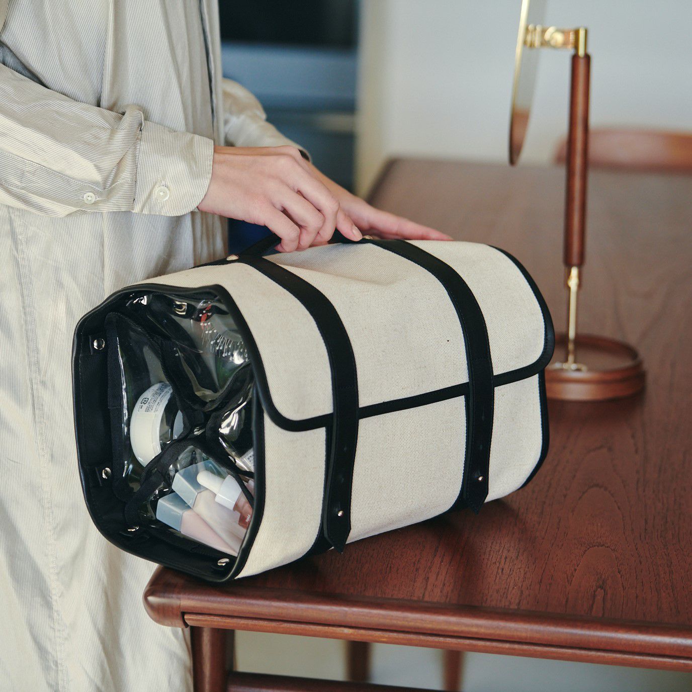 異なる形状のアイテムを一緒に仕舞える、三角柱の透明なPVCケースを内蔵したキャビネットバッグ。