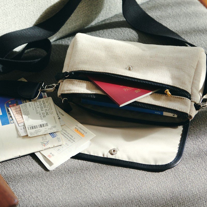 チケットとパスポート お財布や鍵などの貴重品を入れられるように、 ファスナー付きポケットを採用してます。