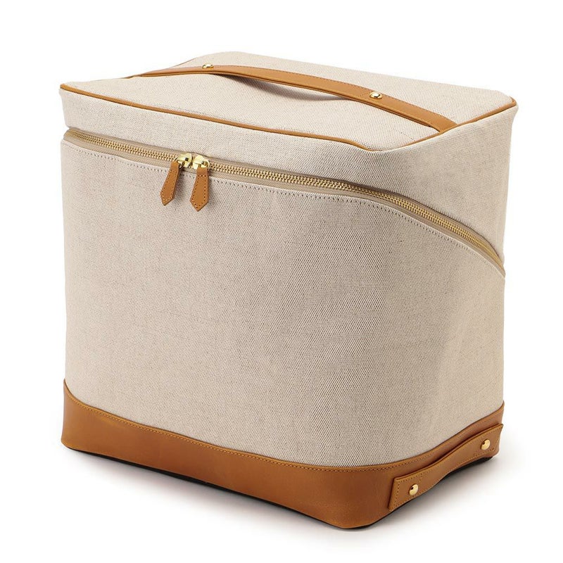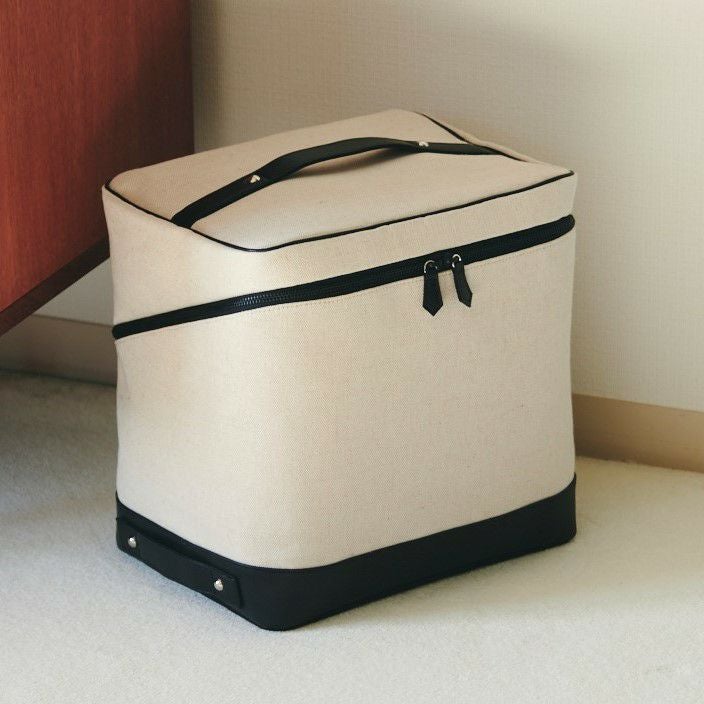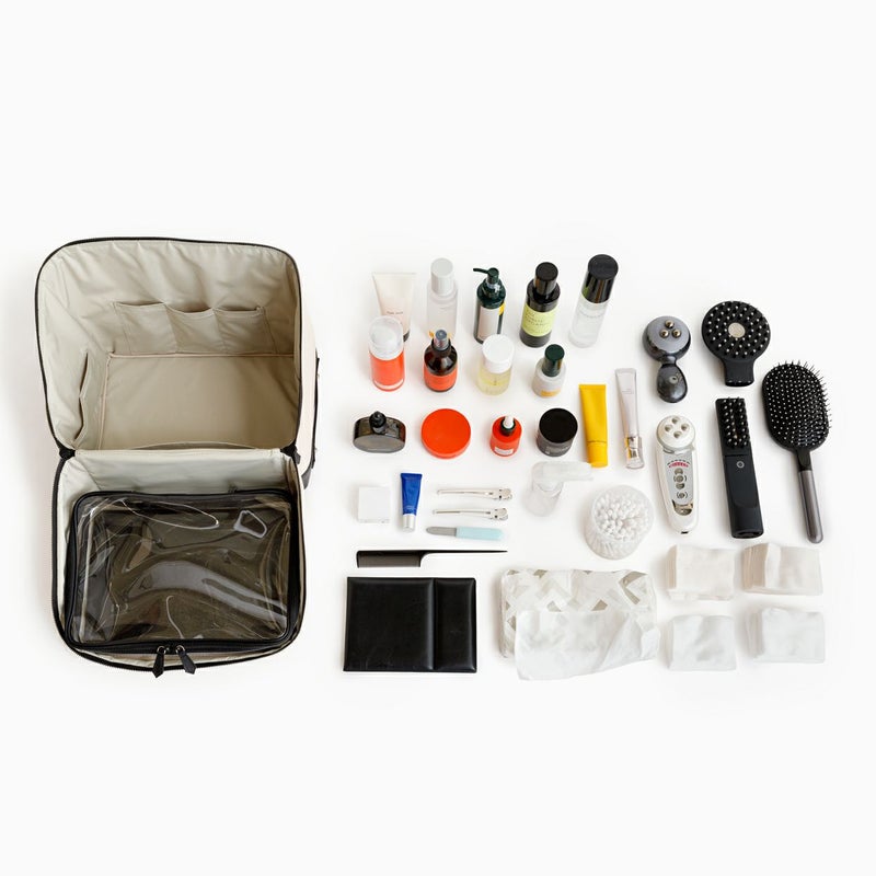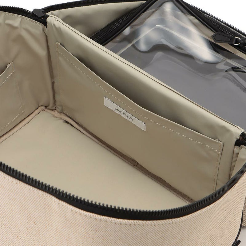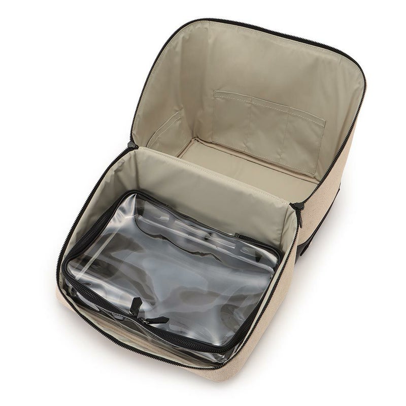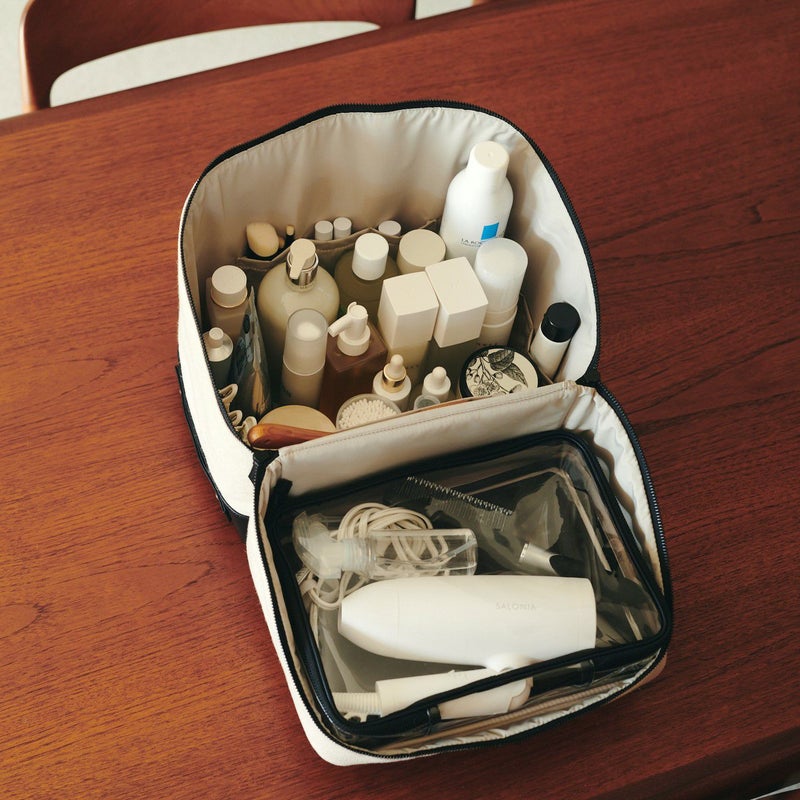 バッグ内の側面のポケットには、チューブタイプのコスメや、目薬、ヘアゴムなど細々したものを仕分けするのに便利です。ボトム部分の両サイドにハンドルが付いているので重量があっても安定して持ちやすく、自分専用の「持ち運べるメイクBOX」として、ご使用いただけます。