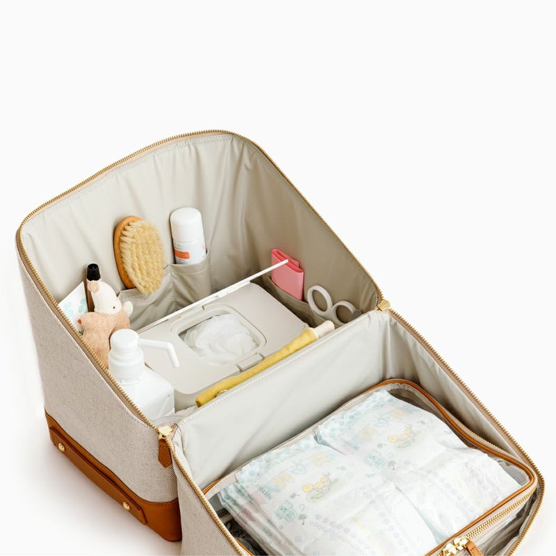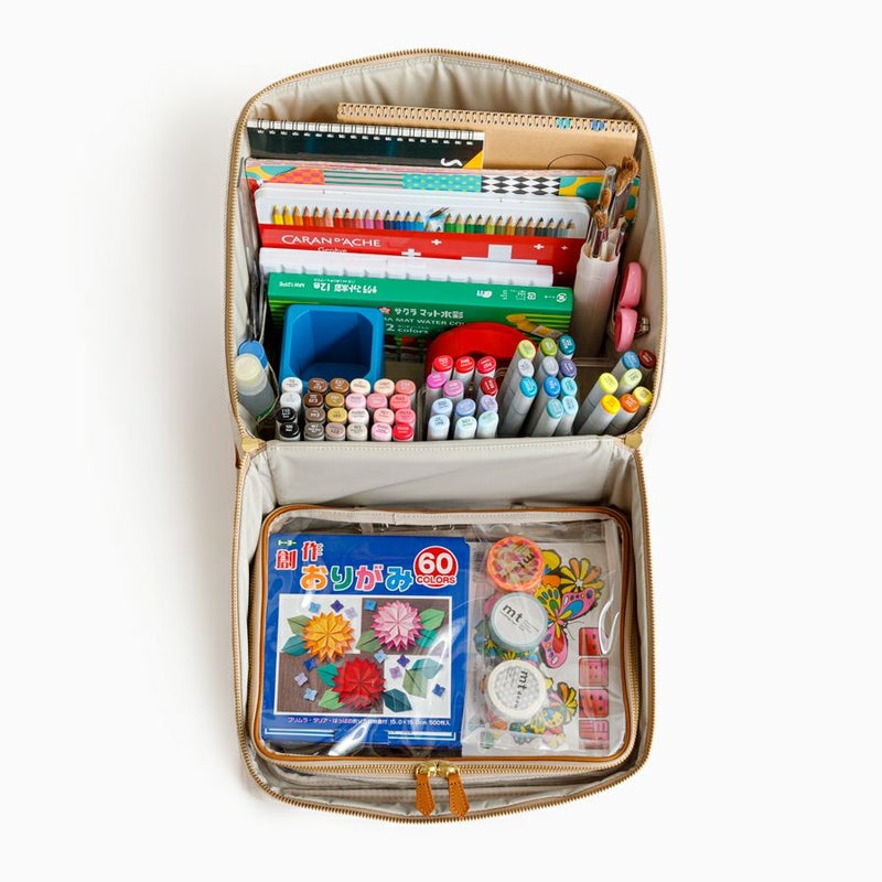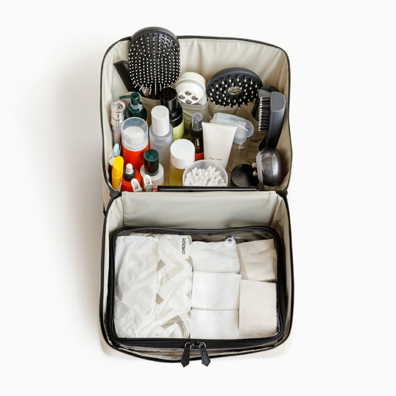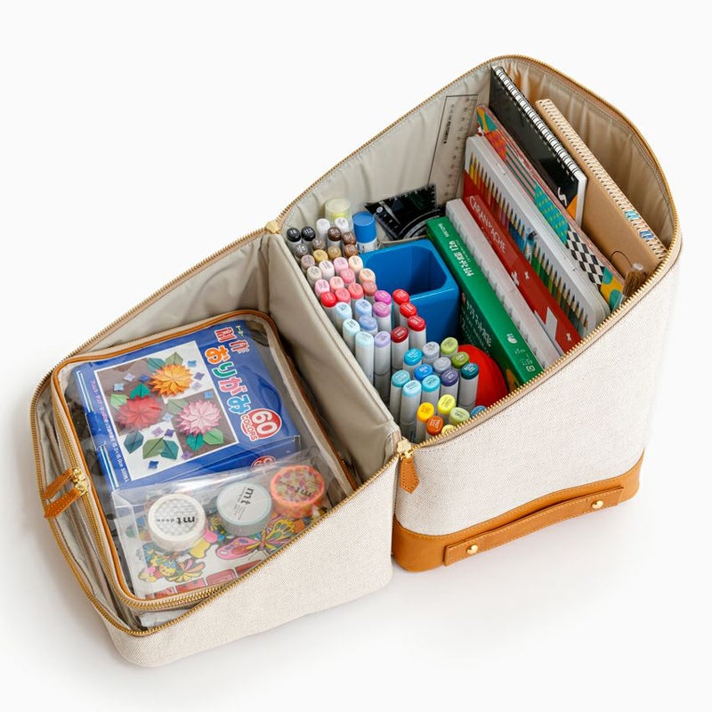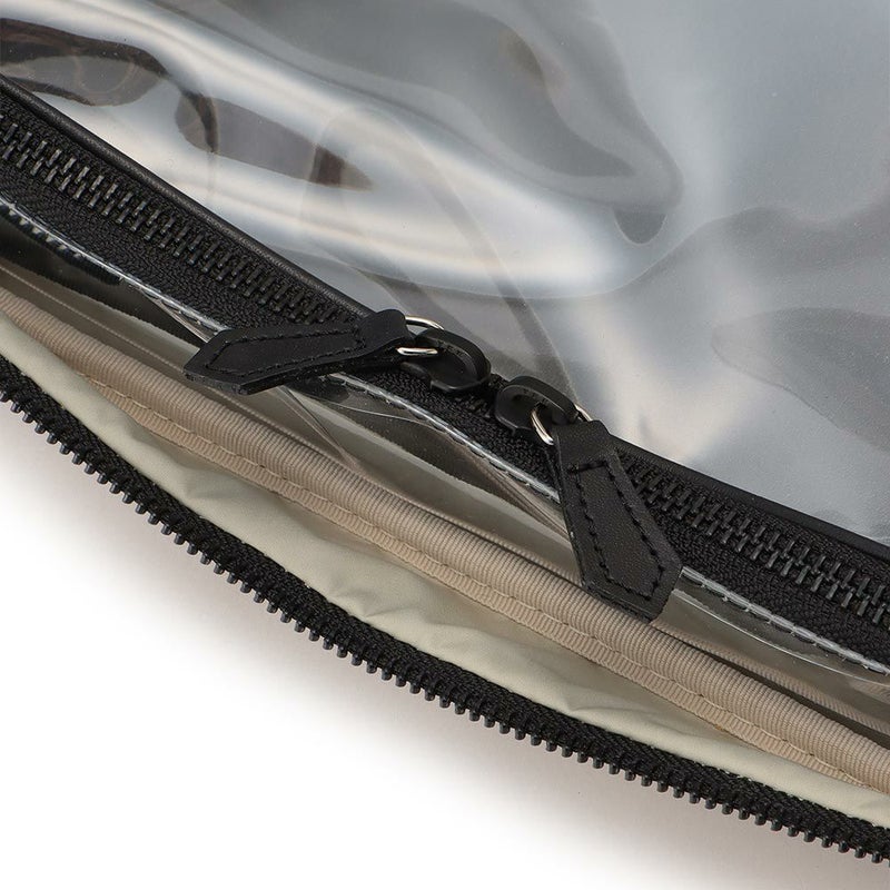 バッグ内の側面のポケットには、チューブタイプのコスメや、目薬、ヘアゴムなど細々したものを仕分けするのに便利です。ボトム部分の両サイドにハンドルが付いているので重量があっても安定して持ちやすく、自分専用の「持ち運べるメイクBOX」として、ご使用いただけます。