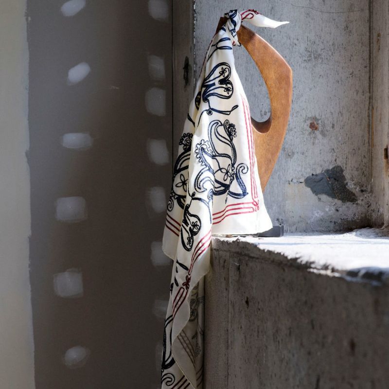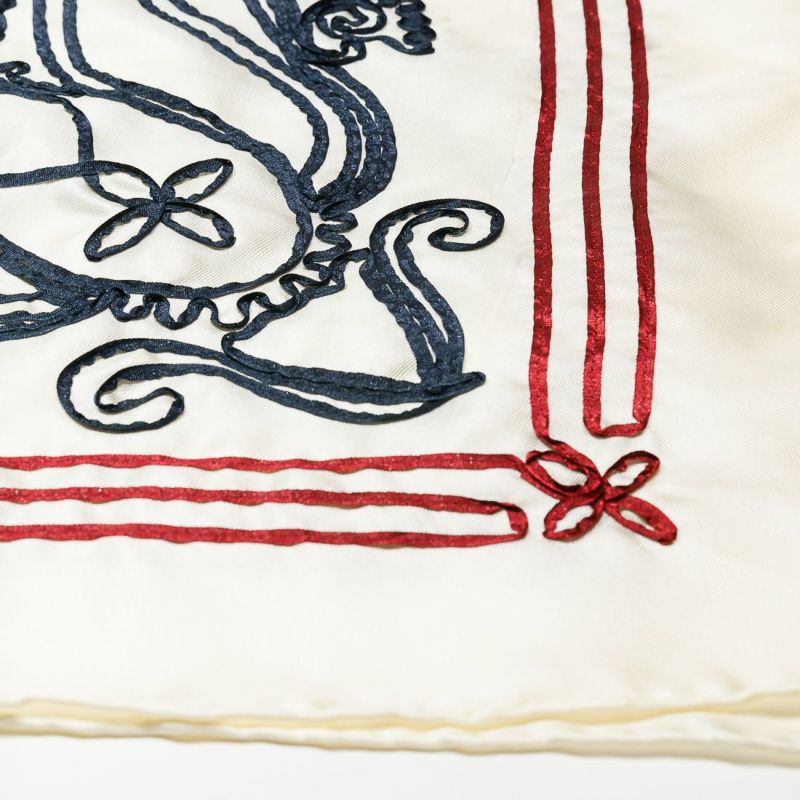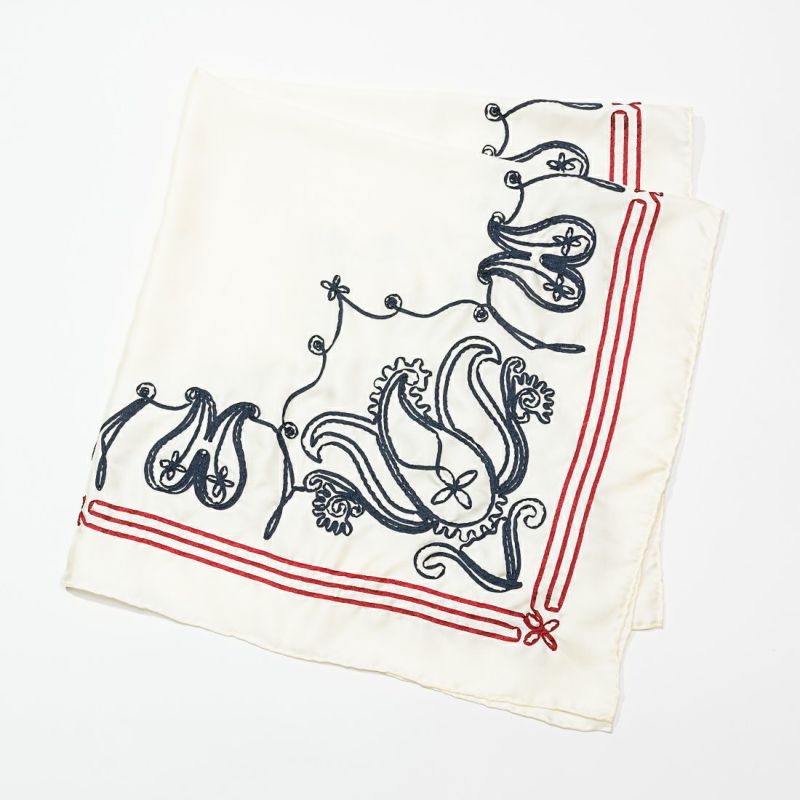 ヴィンテージのバンダナ柄をコード刺繍を使ってシルクスカーフにモディファイしました。
