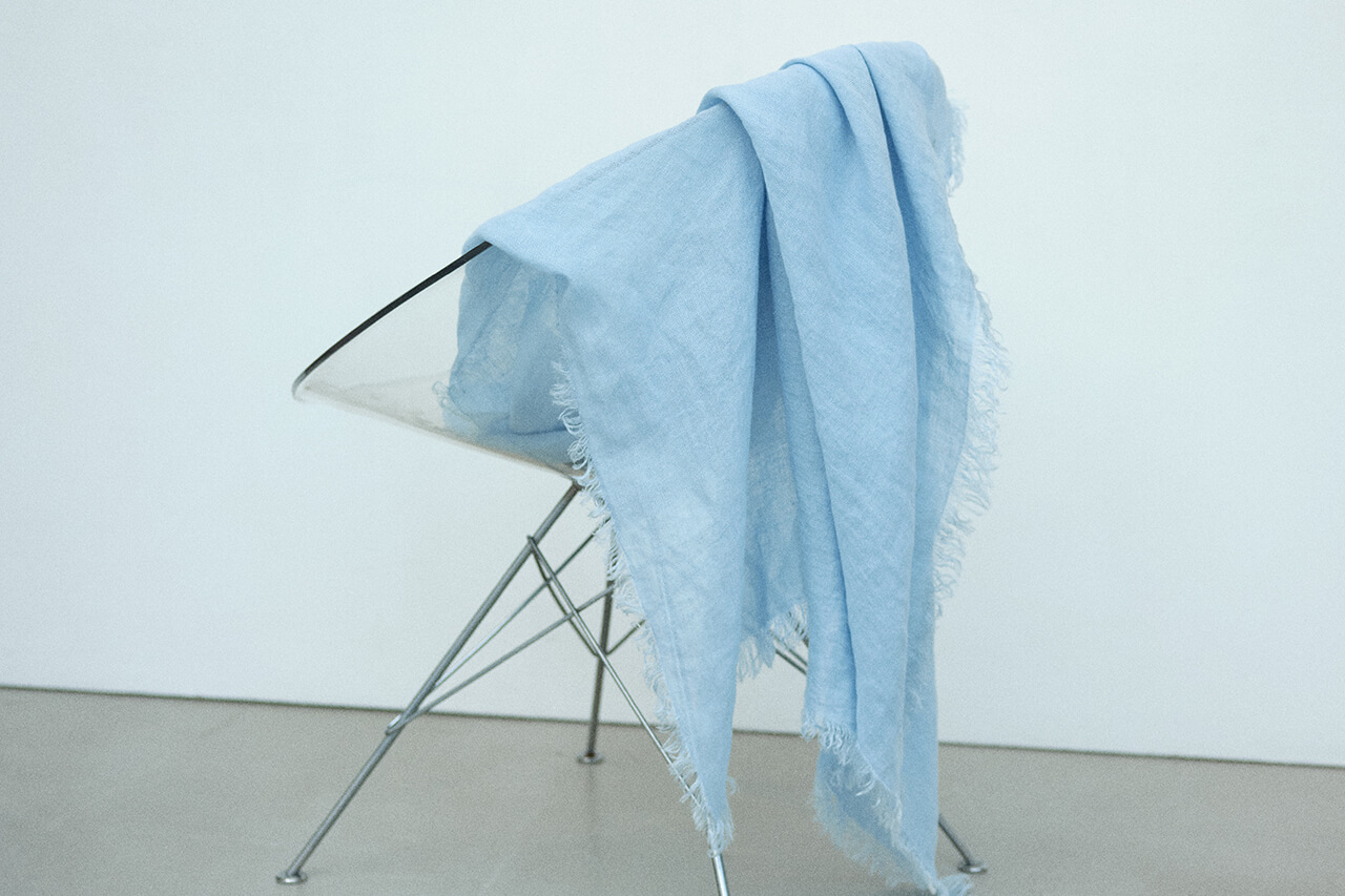 今回はさらにその原点に立ち返り、心地よいストールがもたらす幸せとは何かということを考え、素材を見直し、熟練の職人たちと向き合って生まれた、カゴ染めによる染色、手横編機によるニットストールの新しいコレクション。