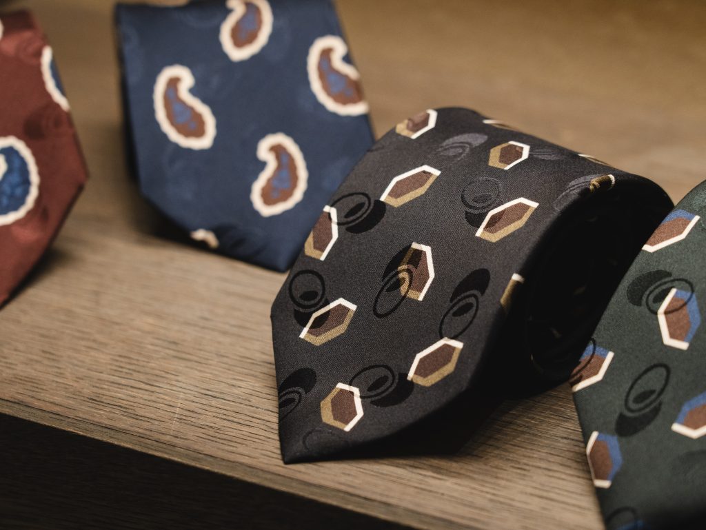 一見よくあるプリントタイに見えますが、こちらのシリーズは、地紋(元から柄の入った生地)に上からプリントを施すことで立体感のある生地になっています。
