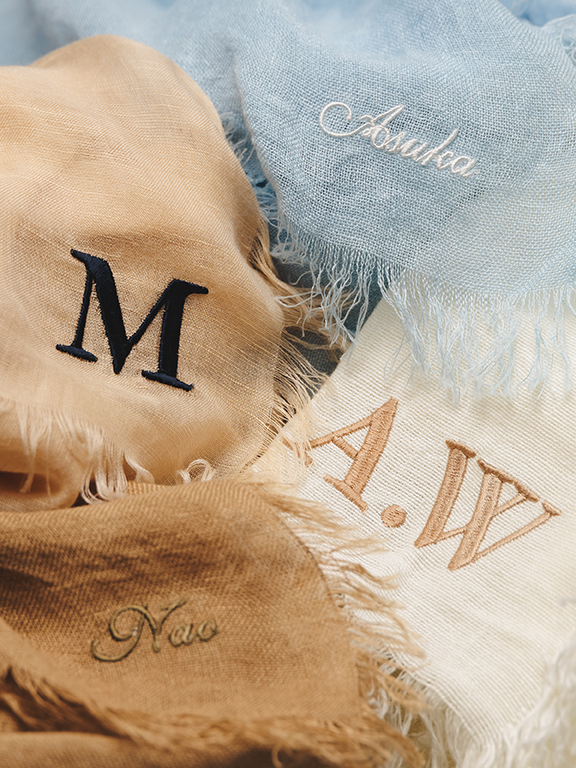 ASAUCE MELERのストールを22,000円以上お買上げいただいた、各日先着30名様に、ご購入いただいた商品にお好きなアルファベットやモチーフ(5文字まで)をお選びいただき刺繍をお入れします。